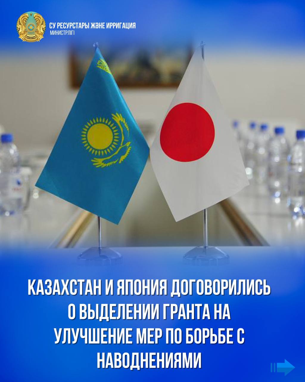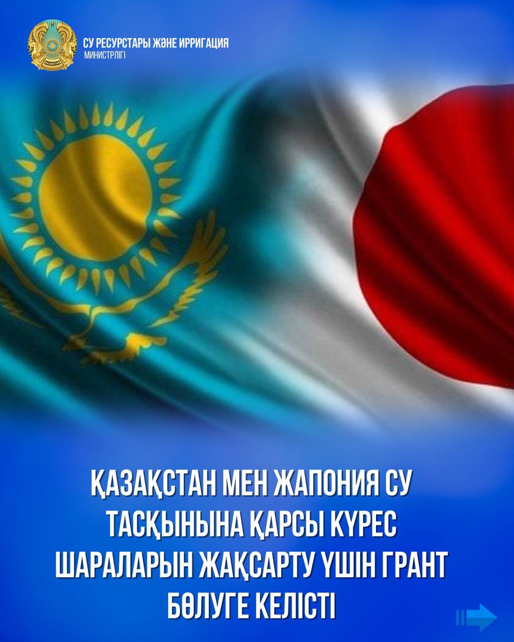 Су ресурстары және ирригация министрлігі Жапония үкіметімен бөгеттерді кешенді басқару арқылы Қазақстандағы су тасқынына қарсы шараларды жақсарту жобасын жүзеге асыру үшін 2 млн доллар көлемінде грант бөлуге келісті.
