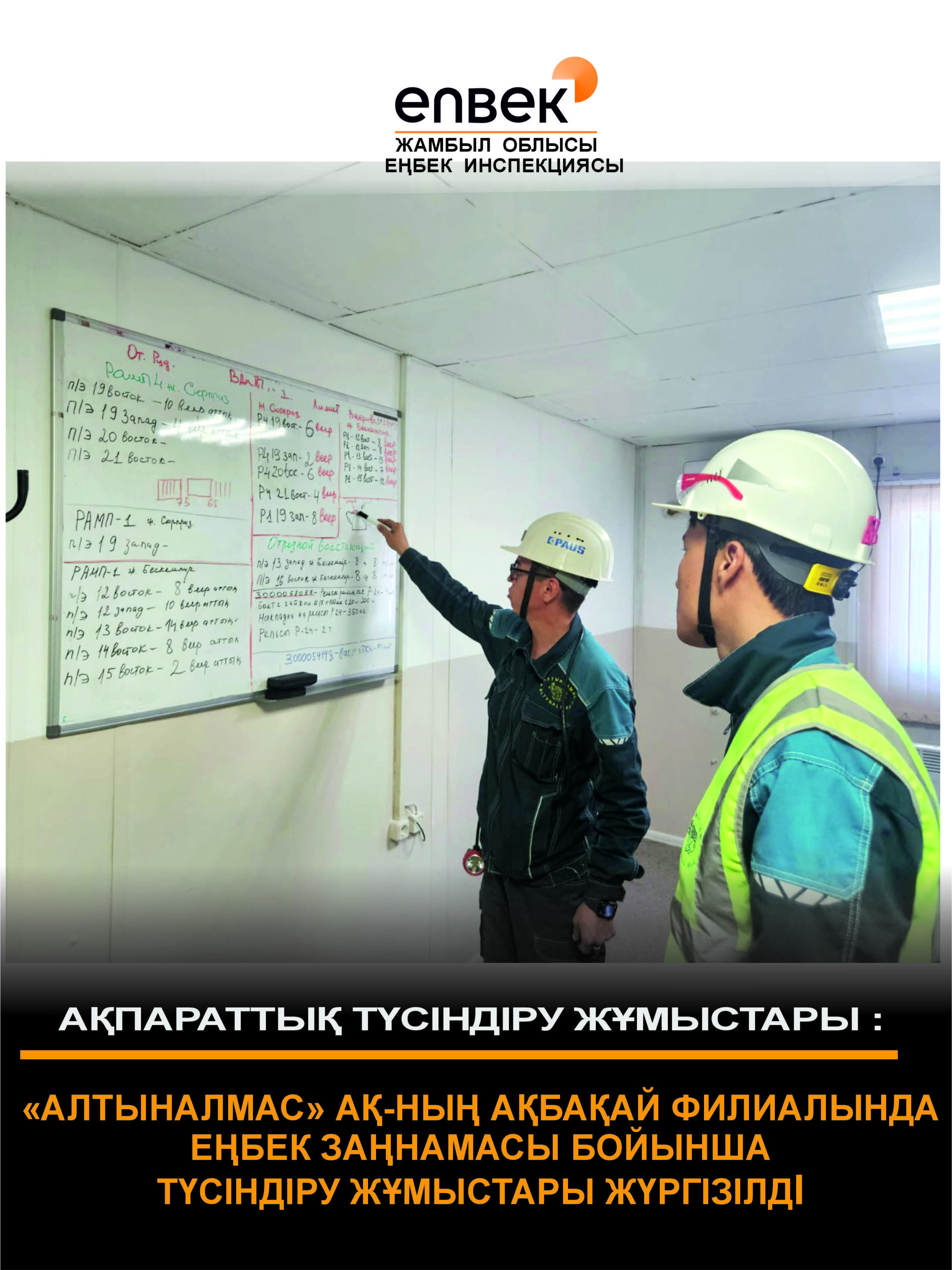 Жамбыл облысы прокуратурасының талабы негізінде «Алтыналмас» АҚ-ның Ақбақай филиалында еңбек заңнамасы талаптарының сақталуына мемлекеттік еңбек инспекторлары Б.Кураметов, А.Биболмен жүргізілген тексеру барысы.
