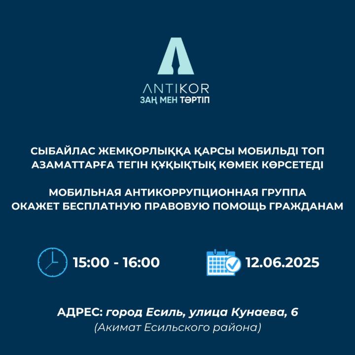 12 маусым күні сағат 15:00-16:00 аралығында Есіл ауданының әкімдігінде (өткізілетін орны: Есіл қ., Қонаев көшесі, 6)«Сыбайлас жемқорлыққа қарсы мобильдік топ» жобасы аясында азаматтарды қабылдау өтеді.