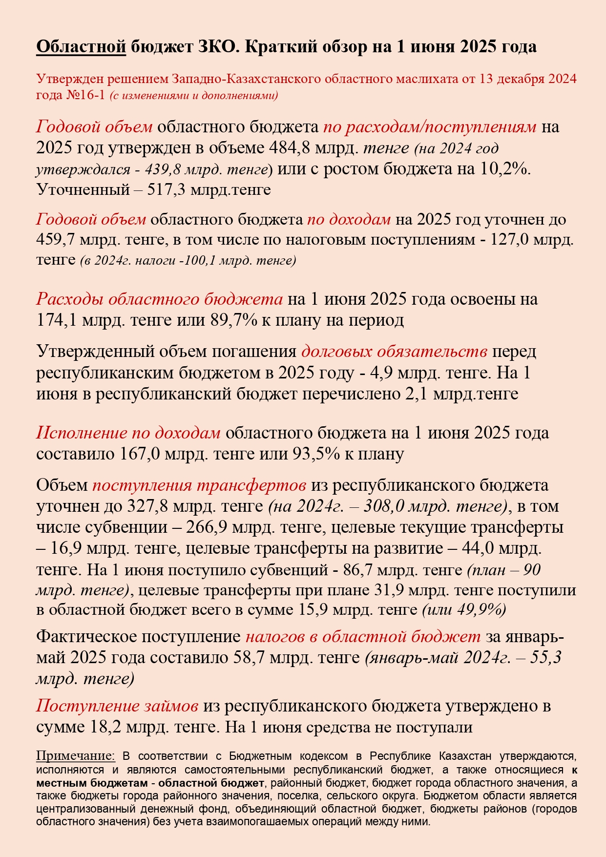 2025 жылдың 1 маусымына облыстық бюджеттің кірістері бойынша атқарылуы 167,0 млрд. теңге немесе жоспарға 93,5% құрады
