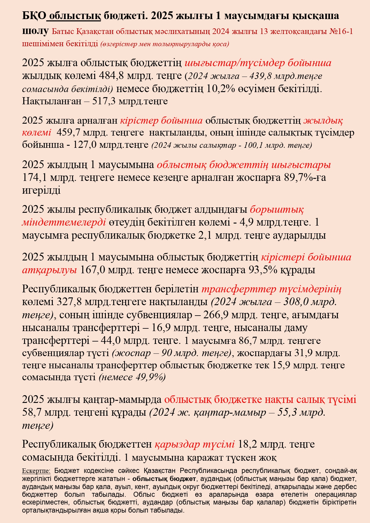 Республикалық бюджеттен берілетін трансферттер түсімдерінің көлемі 327,8 млрд.теңгеге нақтыланды (2024 жылға – 308,0 млрд. теңге), соның ішінде субвенциялар – 266,9 млрд. теңге, ағымдағы нысаналы трансферттері – 16,9 млрд. теңге, нысаналы даму трансферттері – 44,0 млрд. теңге. 1 маусымға 86,7 млрд. теңгеге субвенциялар түсті (жоспар – 90 млрд. теңге), жоспардағы 31,9 млрд. теңге нысаналы трансферттер облыстық бюджетке тек 15,9 млрд. теңге сомасында түсті (немесе 49,9%)