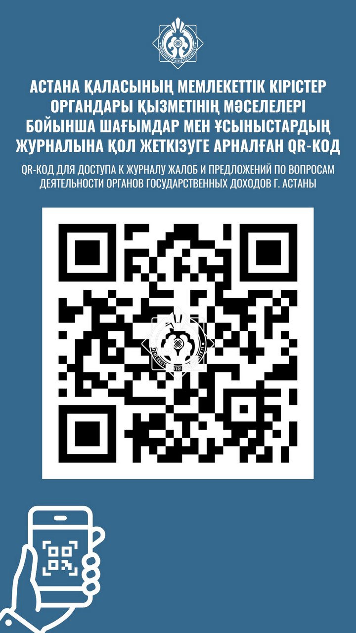 Құрметті салық төлеушілер, егер сіз әдеп жөніндегі бұзушылыққа тап болсаңыз немесе Астананың салық органдарының жұмысын жақсартуды ұсынғыңыз келсе — QR кодын сканерлеп, сұрауыңызды жіберіңіз.