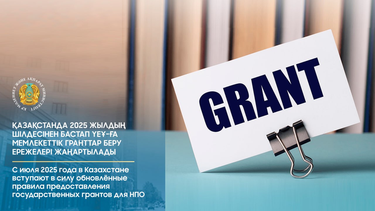 2025 жылдың шілде айынан бастап Қазақстан Республикасында үкіметтік емес ұйымдарға (ҮЕҰ) мемлекеттік гранттарды әзірлеу, беру, мониторинг жүргізу және тиімділігін бағалау бойынша жаңартылған Ережелер күшіне енеді. Бұл — азаматтық қоғам институттарын мемлекеттік қолдау жүйесін барынша ашық, нәтижелі әрі ыңғайлы етуге бағытталған гранттық жүйені реформалаудың соңғы кезеңі.