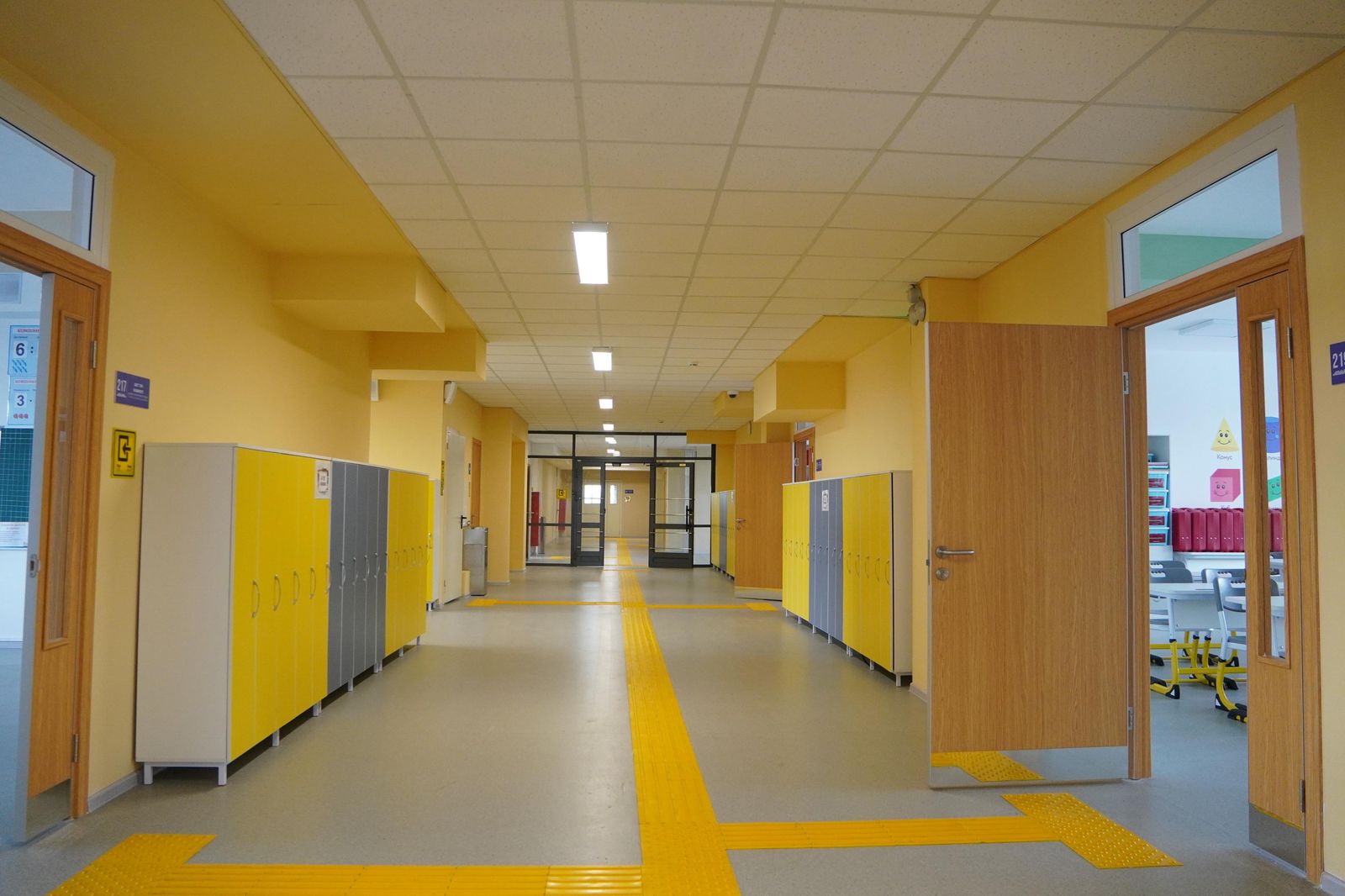 Оқушылардың қауіпсіздігін қамтамасыз ету үшін бейнебақылау жүйесі, кіруді бақылау, жеке шкафтар, лифт, пандус және тактильді белгілер орнатылған.