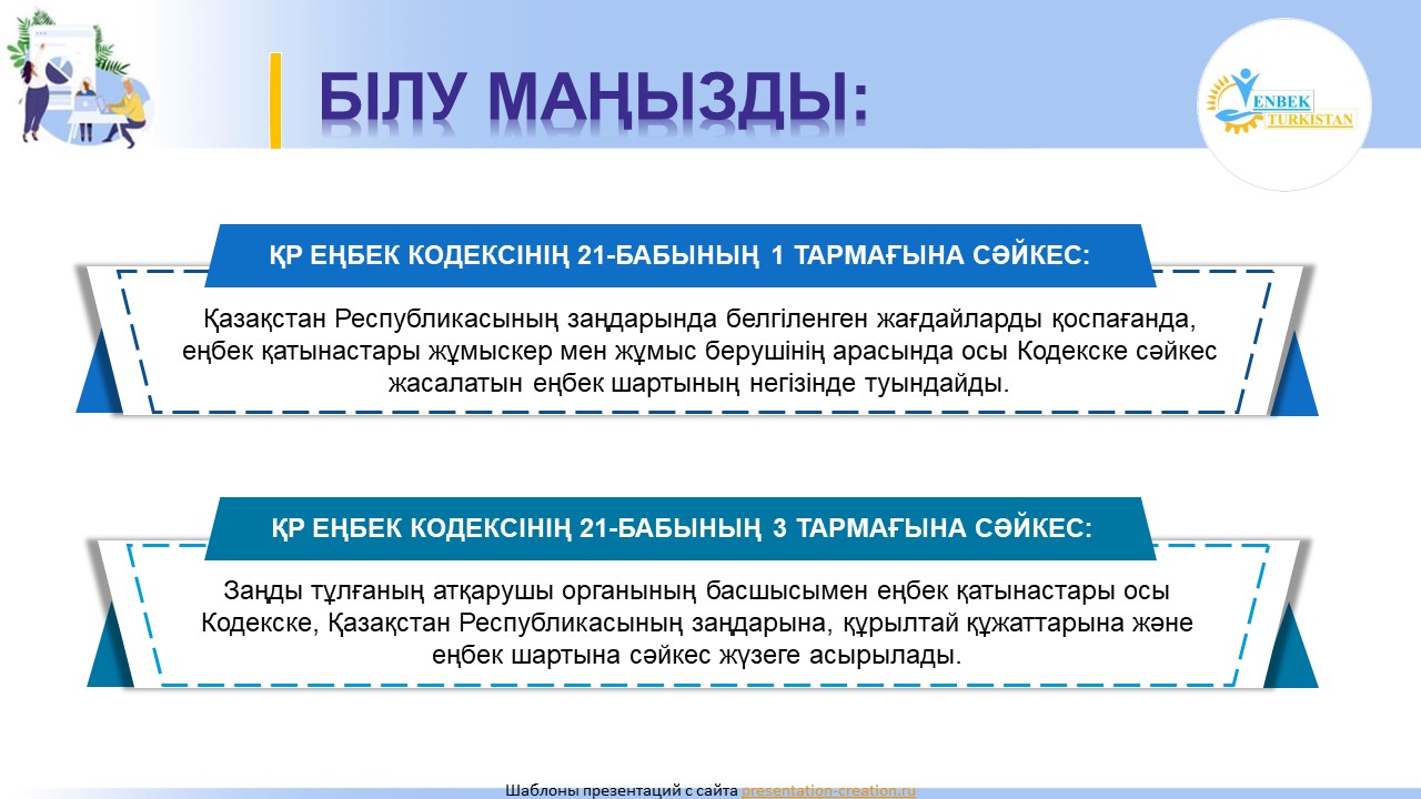 Еңбек қатынастары – Қазақстан Республикасының еңбек заңнамасында, келісімдерде, еңбек, ұжымдық шарттарда және жұмыс берушінің актілерінде көзделген құқықтар мен міндеттерді жүзеге асыру кезінде жұмыскер мен жұмыс берушінің арасында туындайтын қатынастар.