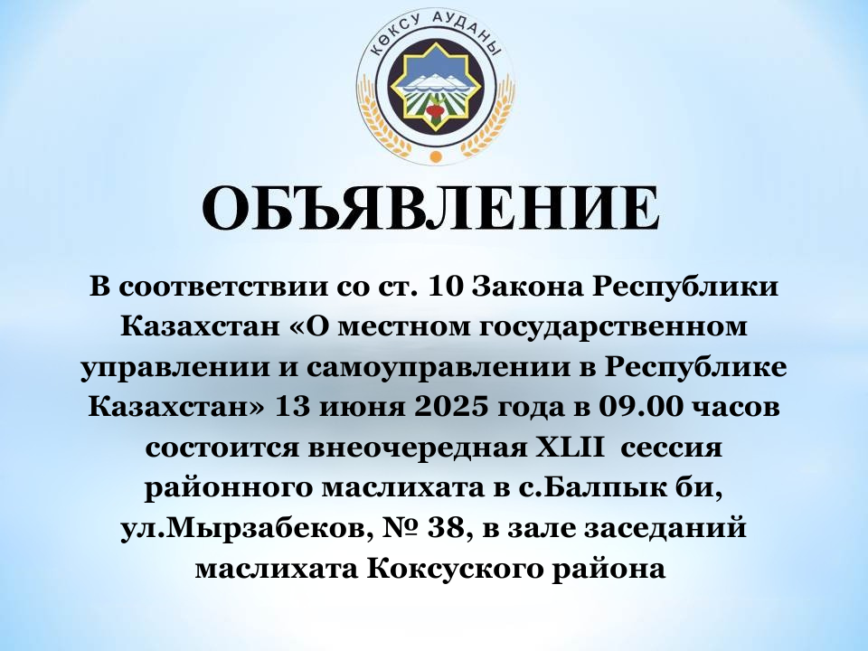 В соответствии со ст. 10 Закона Республики Казахстан «О местном государственном управлении и самоуправлении в Республике Казахстан» 13 июня 2025 года в 09.00 часов состоится вне очередная XLII сессия районного маслихата в с.Балпык би, ул.Мырзабекова, №38, в зале заседаний маслихата Коксуского района