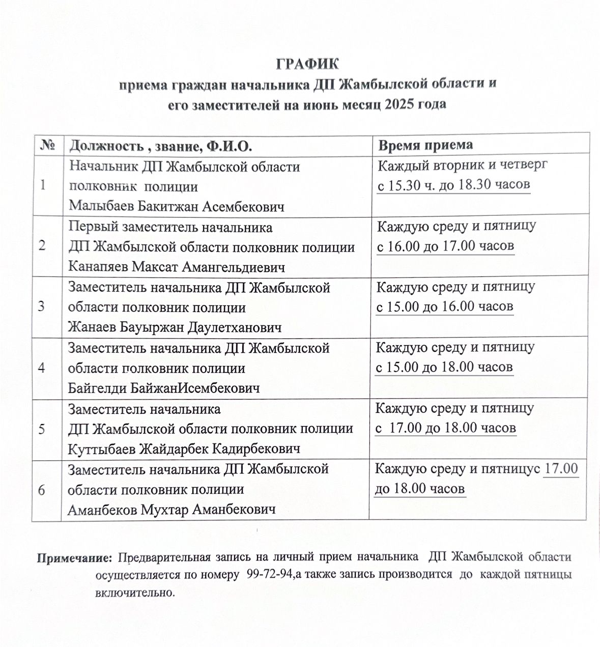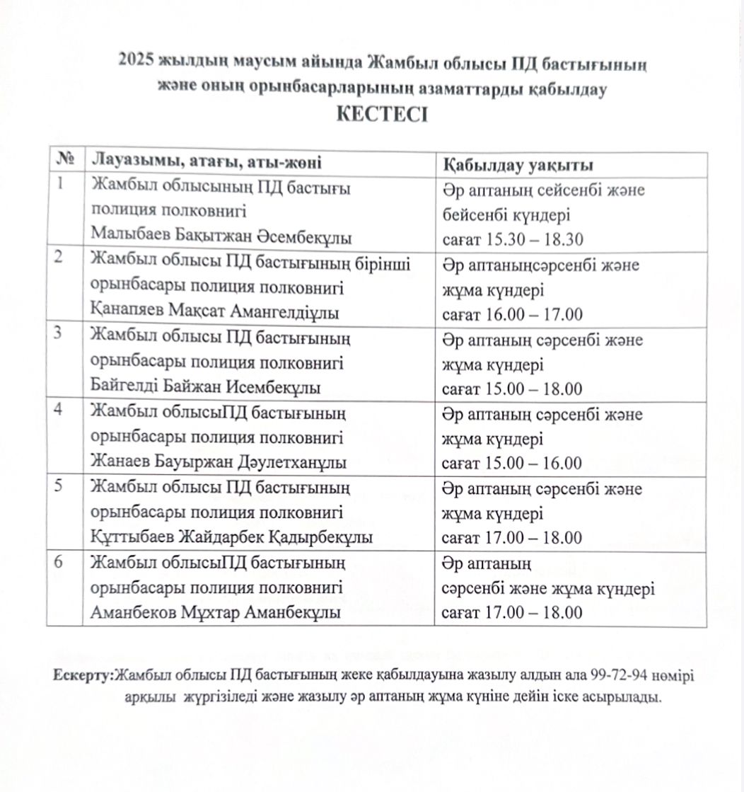 Ескерту:Жамбыл облысы ПД бастығының жеке қабылдауына жазылу алдын ала 99-72-94 нөмірі арқылы жүргізіледі және жазылу әр аптаның жұма күніне дейін іске асырылады.