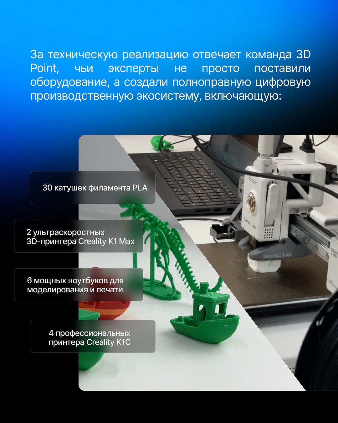 👨🔧 Техникалық іске асырушысы — 3D Point командасы. Олар жабдықты орнатып қана қоймай, жастарға арналған толыққанды өндірістік орта құрып берді.