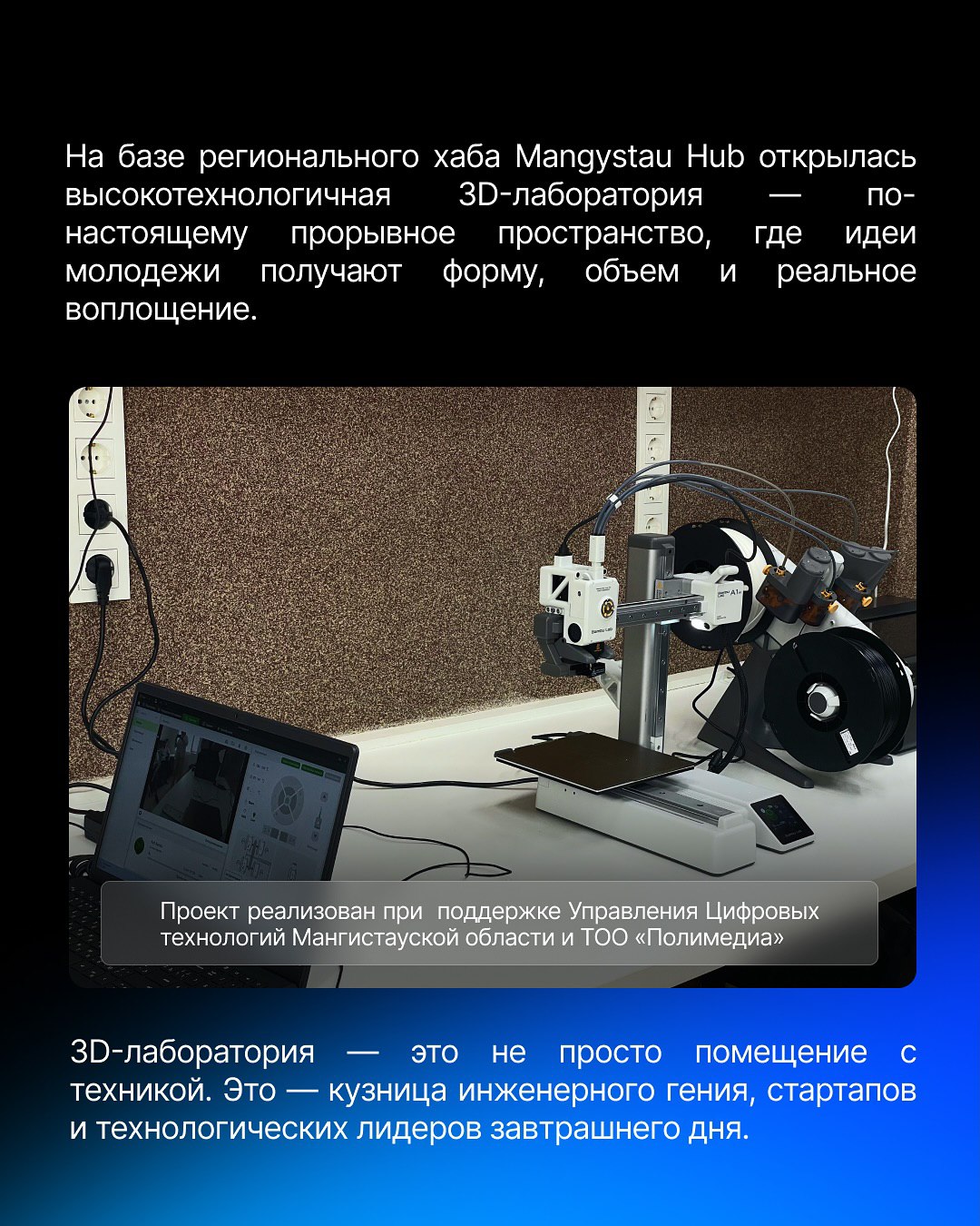 🔬 3D-зертхана — бұл жай ғана техника емес. Бұл — ертеңгі инженерлер мен технологиялық стартаптардың ұясы. Мұнда креатив нақты нәтижеге айналып, болашақтың жобалары дүниеге келеді.