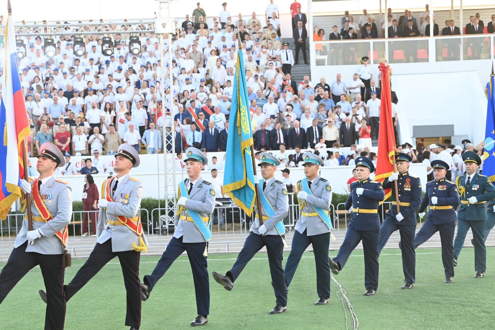Шара Байқоңыр кешеніндегі 14 ұйым мен мекеме ұжымдарының шеруімен басталды. Одан кейін екі елдің Мемлекеттік Гимндері орындалып, Қазақстан Республикасының Президенті Қасым-Жомарт Тоқаев пен Ресей Президенті Владимир Путиннің бейнеқұттықтаулары көрсетілді.