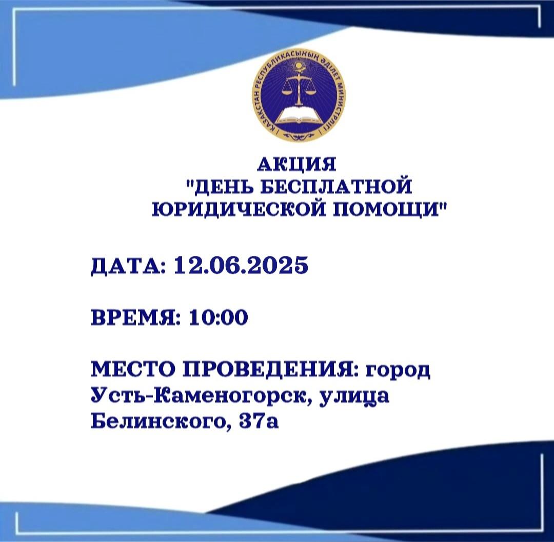 🔹️Шығыс Қазақстан облысының Әділет департаменті ағымдағы жылдың 12 маусымында азаматтарға құқық консультациялар беру мақсатында
