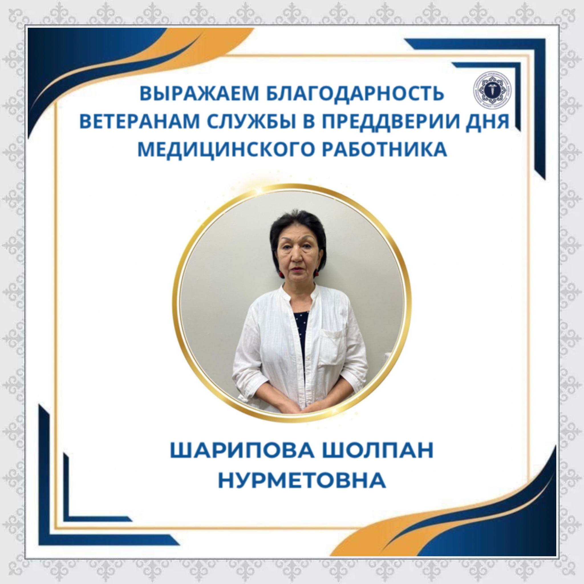 Алматы қаласының санитариялық-эпидемиологиялық бақылау департаменті Шолпан Нұрметқызы Шәріповаға көп жылдық еңбегі үшін алғыс айтады.