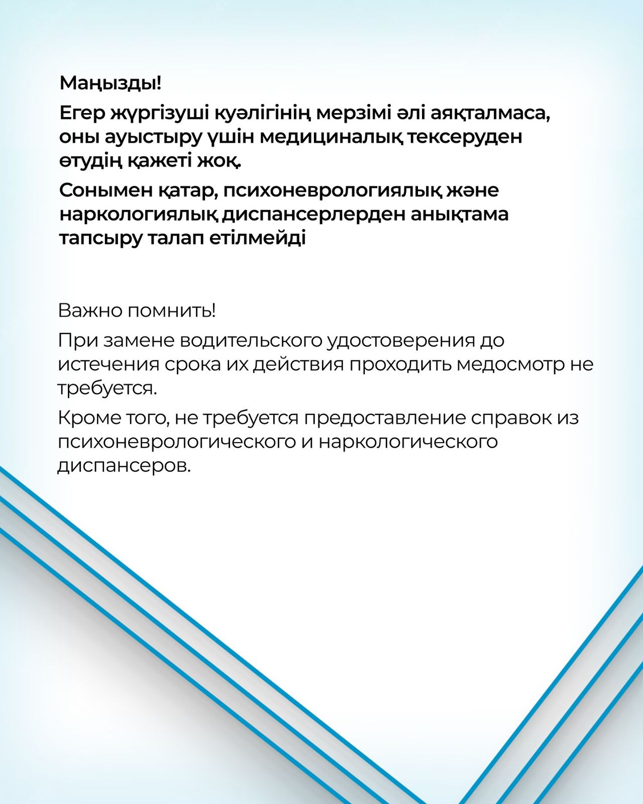 Айта кету керек, жүргізуші куәлігінің қолданылу мерзімі аяқталмай тұрып ауыстырылған жағдайда, медициналық тексеруден өту талап етілмейді. Сондай-ақ, психоневрологиялық және наркологиялық диспансерлерден анықтама ұсыну қажеттілігі жоқ.