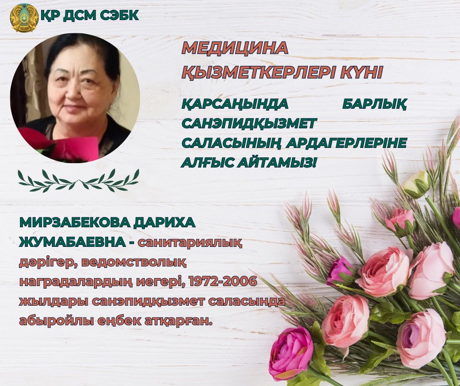 Мирзабековна Дариха Жумабаевна, 1948 жылы 4 желтоқсанда Қызылорда қаласында дүниеге келген. 1972 жылы Қарағанды мемлекеттік медициналық институтын «Санитариялық дәрігер» мамандығы бойынша тәмамдады. 1972-2006 жылдар аралығында Қызылорда өңіріндегі СЭС қызметінде санитариялық дәрігер болып жұмыс жасады. Санитариялық-эпидемиологиялық қызметте 34 жылдық еңбек тәжірибесі бар санитариялық дәрігер.
