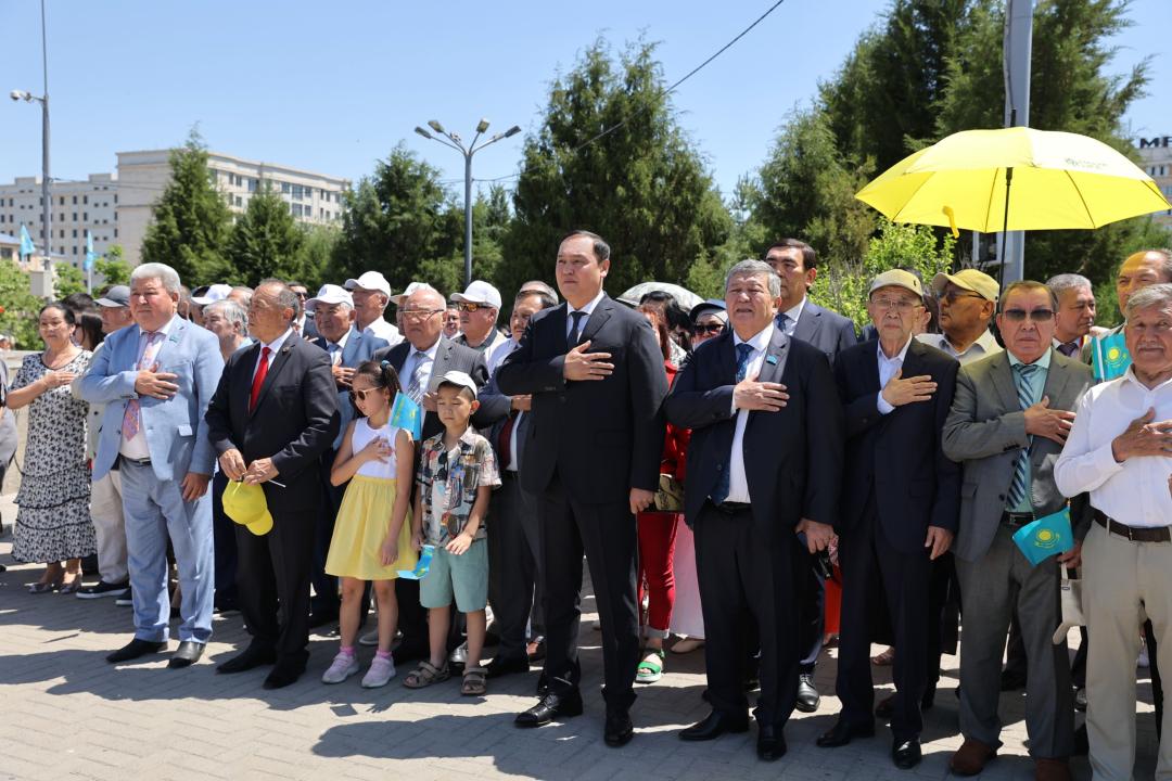 Әуелі жиналған жұртшылық Қазақстан Республикасының Мемлекеттік әнұранын асқақтата орындап, көк Тудың көкте қалықтауын зор мақтанышпен тамашалады.