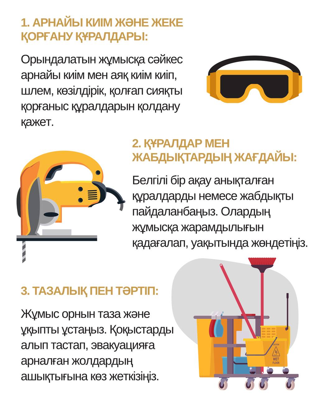 ▫️ҚР Еңбек кодексінің 181-бабына сәйкем қызметкердің қауіпсіздік және еңбекті қорғау талаптарына сай келетін жұмыс орнында істеуге құқығы бар. Біз тәуекелдерді азайтуға және жұмыс кеңістігін ыңғайлы әрі қауіпсіз етуге көмектесетін 10 маңызды ереже.