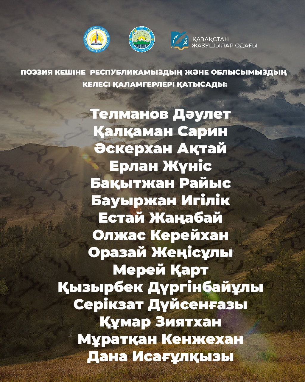 Поэзия кешіне республикамыздың және облысымыздың келесі қаламгерлері қатысады: Телманов Дәулет, Қалқаман Сарин, Әскерхан Ақтай, Ерлан Жүніс, Бақытжан Райыс. Бауыржан Игілік, Естай Жаңабай, Олжас Керейхан, Оразай Жеңісұлы, Мерей Қарт, Қызырбек Дүргінбайұлы, Серікзат Дүйсенғазы, Құмар Зиятхан, Мұратқан Кенжехан, Дана Исағұлқызы.