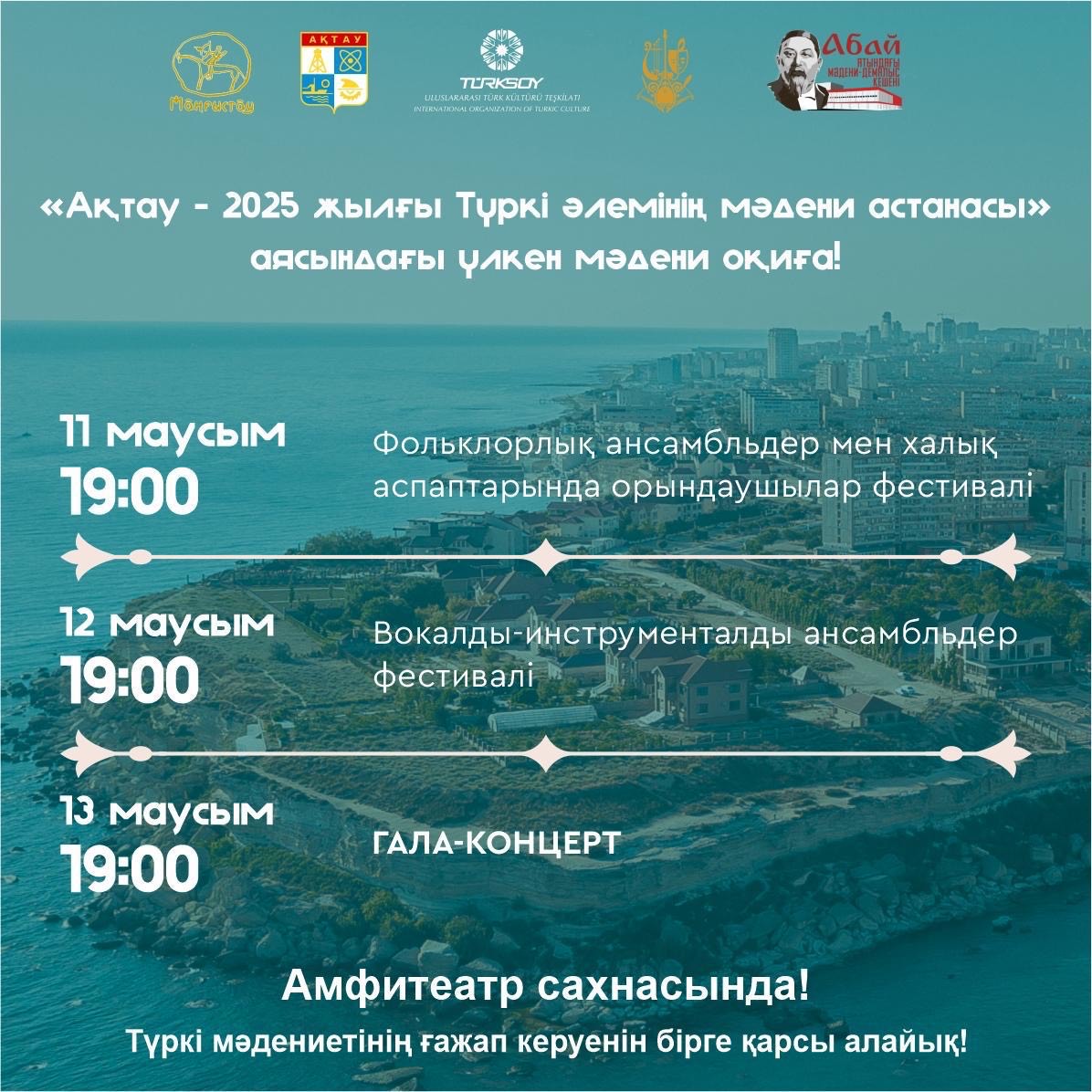 «Ақтау – Түркі әлемінің мәдени астанасы» аясында 11-13 маусым күні теңіз жағалауында фольклорлық ансамбльдер мен халық аспаптарында орындаушылар фестивалі, вокалды-инструменталды ансамбльдер фестивалі ұйымдастырылады. Мәдени шара 13 маусым күні өтетін гала концертке жалғаспақ.