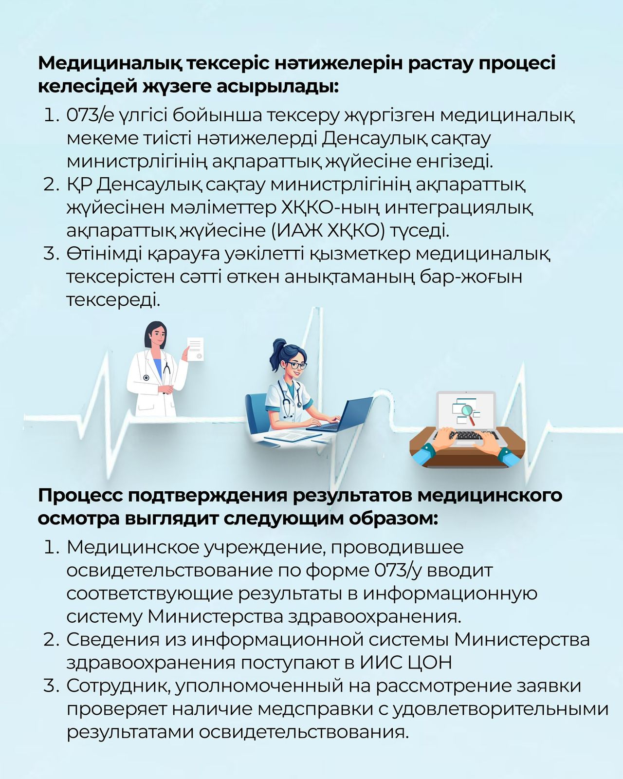 Енді азаматтарға «Жүргізуші куәлігін беру» мемлекеттік қызметін алу кезінде медициналық анықтаманы қағаз түрінде тапсырудың қажеті жоқ. Медициналық тексерудің нәтижесі автоматты түрде ИАЖ ХҚКО-ға келіп түседі. Бұл жаңашылдық өтініштердің қарау мерзімін жеделдетуге, жалған құжаттарды ұсыну жағдайларын болдырмауға және жүргізуші куәлігін алу рәсімінің ашықтығын арттыруға мүмкіндік береді.