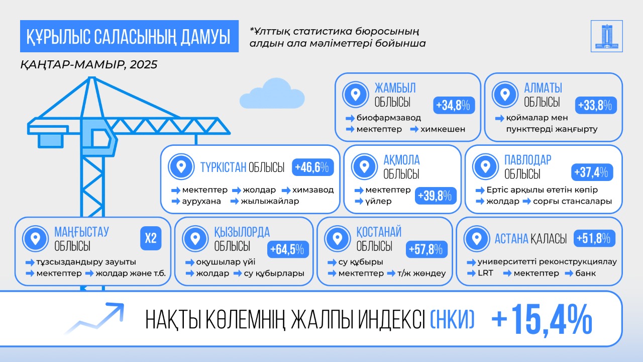 Құрылыс саласы қарқынды дамып келеді, 15,4%-ға өсті. Он сегіз өңірде өсім тіркелді, ал Маңғыстау облысында мектептер, тұщытқыш зауыт, мұнай және су құбырларын қайта жаңарту, аудандық аурухана және автожолдарды жөндеу сияқты ауқымды жобалардың арқасында жұмыс көлемі екі есеге артты. Қызылорда облысында өсім 64,5%-ды, Қостанайда – 57,8%-ды, Астанада – 51,8%-ды, Түркістан облысында – 46,6%-ды құрады. Тұрғын үй құрылысы да қарқын алып келеді: бес айдың ішінде 6 млн шаршы метрден астам тұрғын үй пайдалануға берілді, бұл былтырмен салыстырғанда 5,7%-ға көп. Ең белсенді құрылыс Түркістан облысында (+25,5%), Шымкент қаласында (+23,4%) және Алматы облысында (+20,4%) байқалды.
