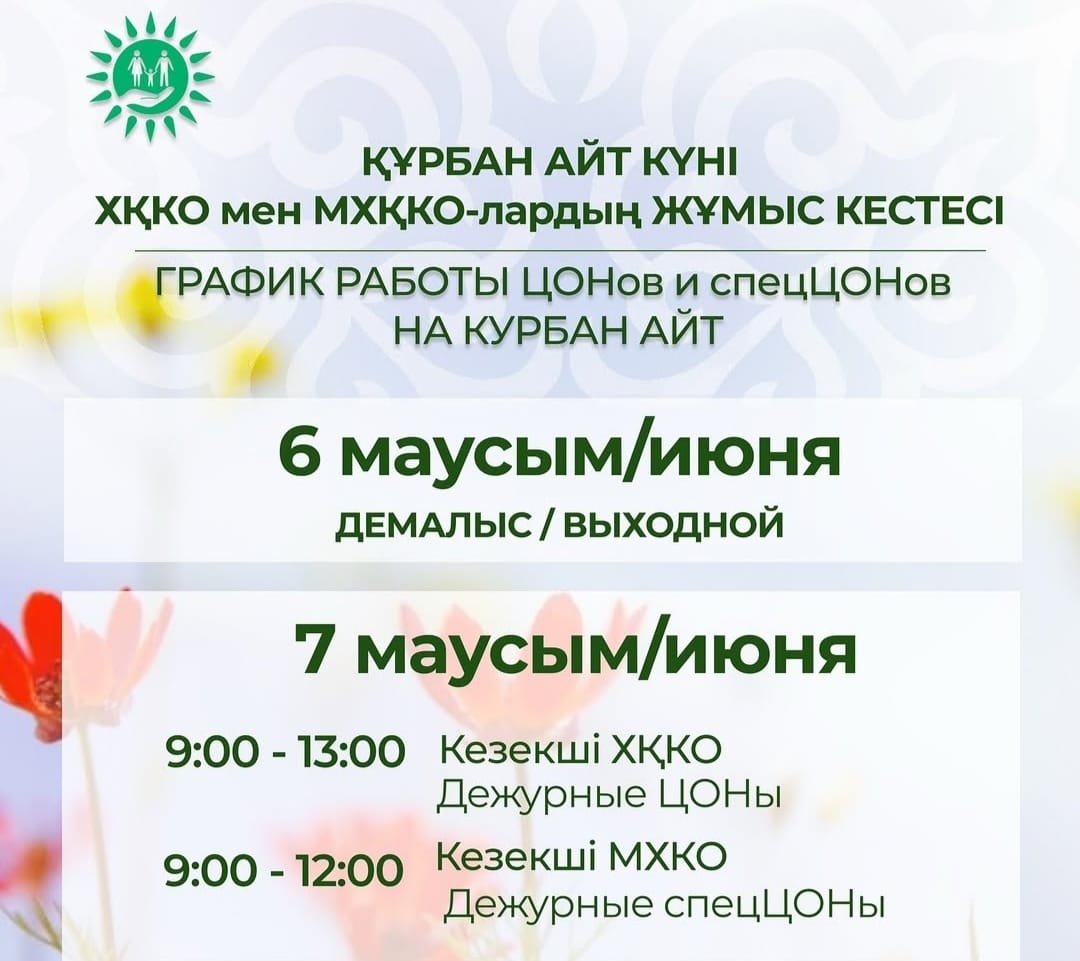 Құрбан айт күні ХҚКО мен мамандандырылған ХҚКО-лардың жұмыс кестесі
