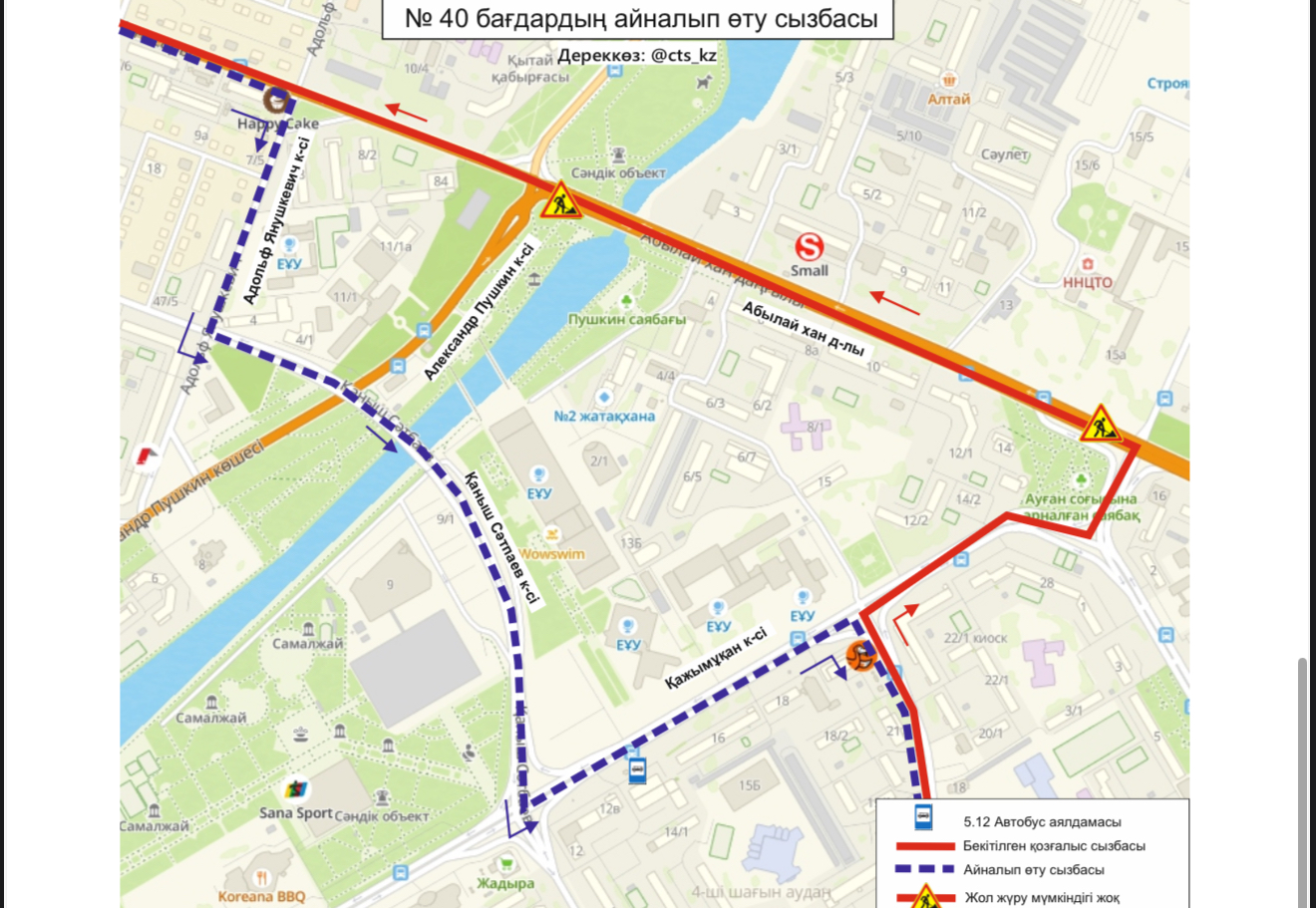 Жүргізушілер мен жаяу жүргіншілерден маршруттарын алдын ала жоспарлап, қозғалыс ұйымдастырудағы ықтимал өзгерістерді ескерулерін сұраймыз. Қауіпсіздікті қамтамасыз ету және ыңғайсыздықты азайту мақсатында уақытша жол белгілері мен көрсеткіштері орнатылады.