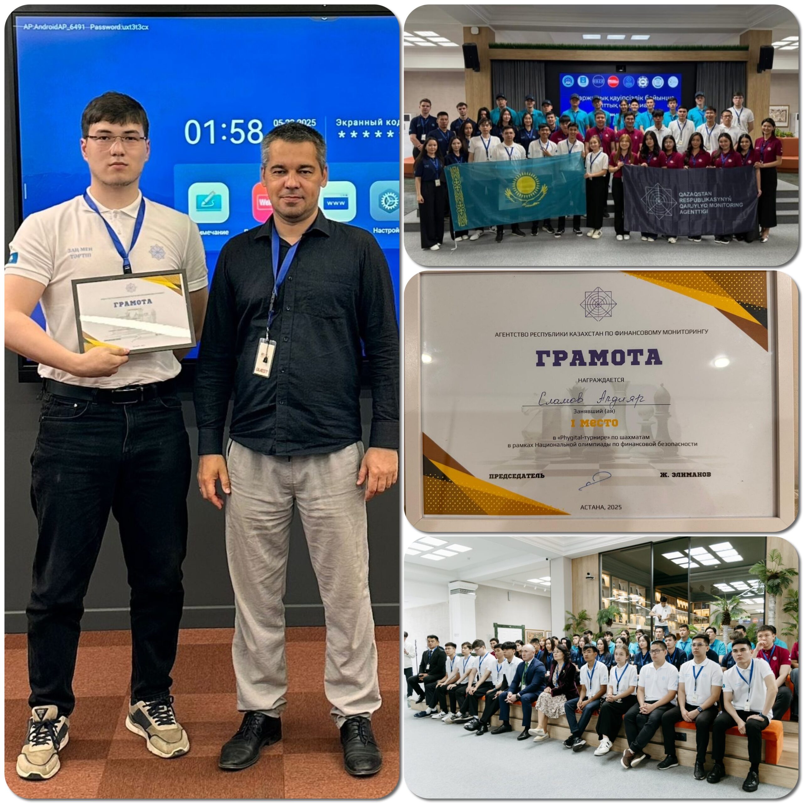 Ағымдағы жылдың 23 мамырында “Toraigyrov University“ 2 курс студенті Алдияр Сламов “қаржы қауіпсіздігі бойынша Ұлттық Олимпиада–2025“ аясында шахматтан “Phygital – турнирде“ 1 орынды жеңіп алды. Қарқынды күрес жағдайында ол лайықты бірінші орынға ие бола отырып, керемет шеберлігін, табандылығын және жеңіске деген ұмтылысын көрсетті. Павлодар облысы бойынша ЭТТД ұжымы Алдиярды шын жүректен құттықтайды және Ұлттық олимпиаданың финалында сенімді жеңіс пен оқуда одан әрі табыстар, жеке амандық пен барлық бастамаларға шабыт тілейді.