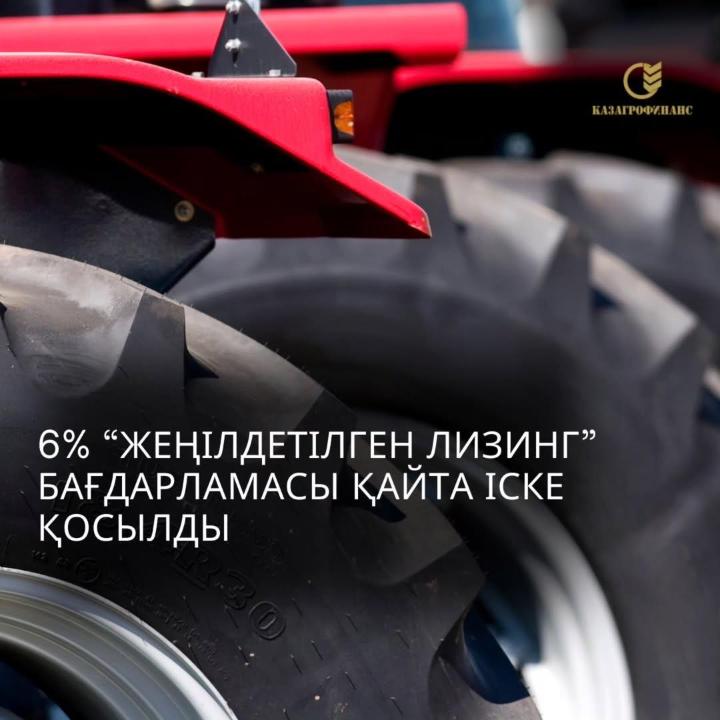 «ҚазАгроҚаржы» АҚ ауыл шаруашылығы техникасының жылдық 6%-бен жеңілдетілген лизинг бағдарламасының қайта басталғанын хабарлайды. Бұл шара техникалық паркті минималды қаржылық жүктемемен жаңартуға мүдделі шаруаларды қолдауға бағытталған деп хабарлайды компанияның баспасөз қызметі.