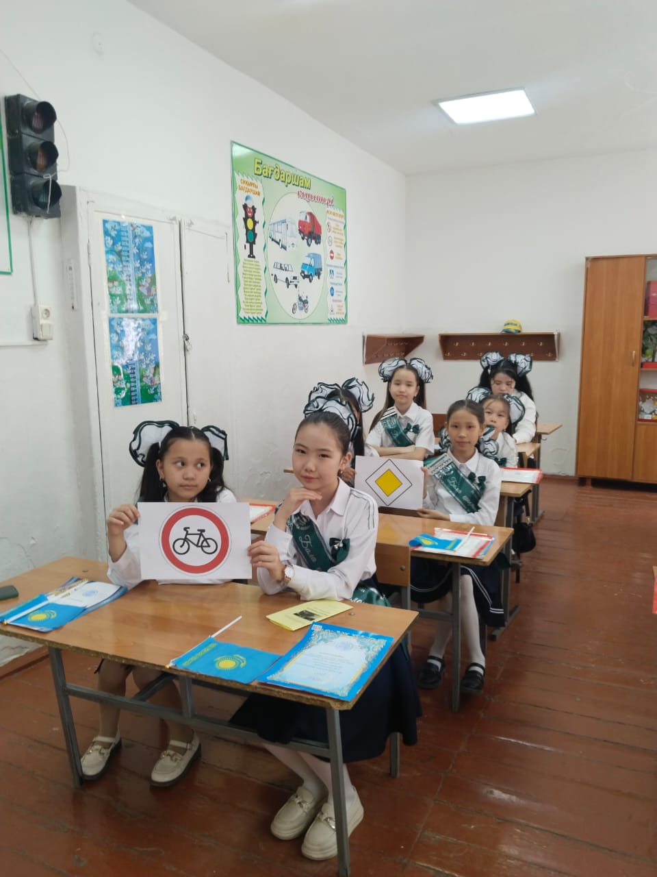 Қатысушылар тақырыптық карточкалар мен плакаттардың көмегімен ойын түрінде жол қауіпсіздігі ережелерінің сақталуы туралы ақпарат алды.