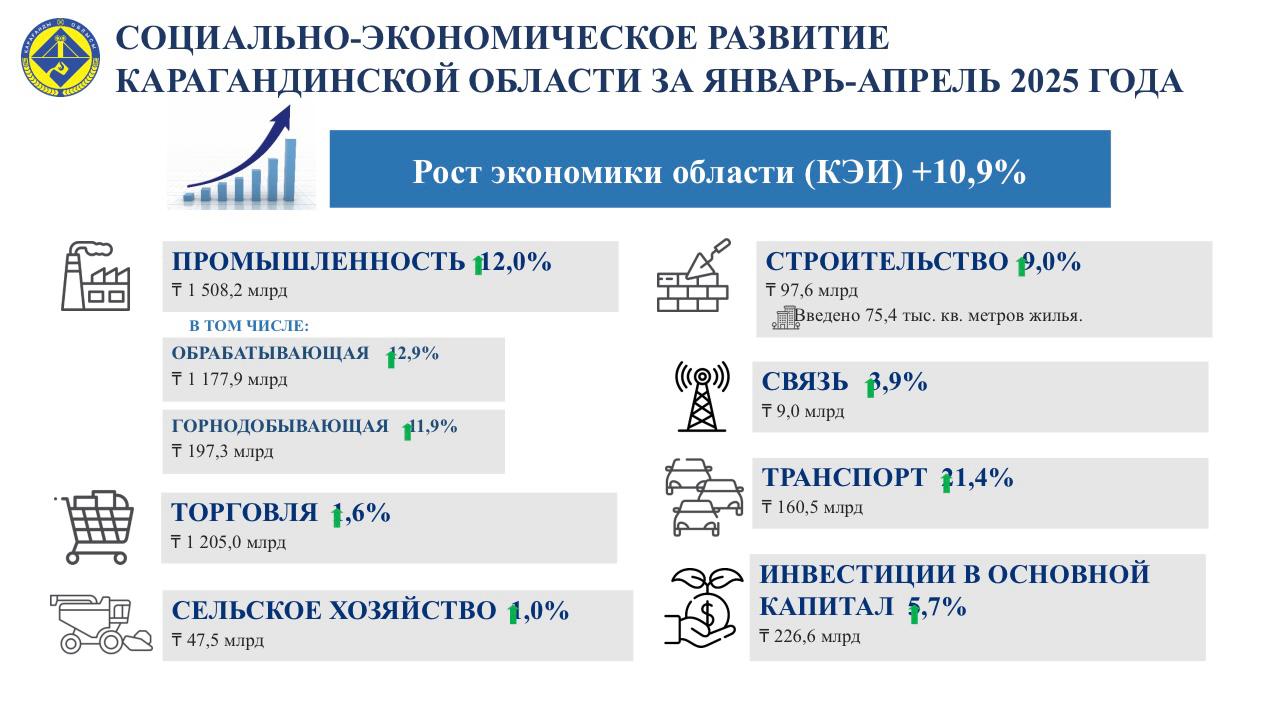 2025 жылдың қаңтар-сәуір айының қорытындысы бойынша Қарағанды облысының әлеуметтік-экономикалық дамуының оң динамикасы қамтамасыз етілді.