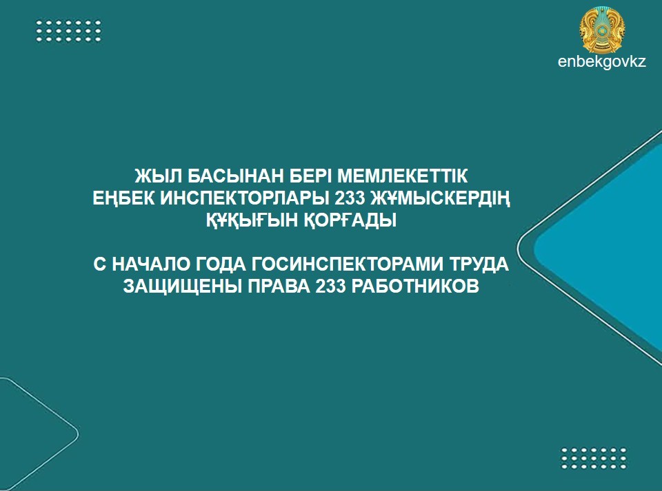 По результатам 87 проверок, проведенных государственными инспекторами труда, выявлено 102 нарушения, выдано 71 предписание. Из них 65 (91,5%) исполнено и 6 (8,4%) имеется сроки. По результатам проведенных проверок в отношении лиц, нарушивших требования трудового законодательства, наложены административные штрафы на сумму 3,5 млн.тенге. Из них 2,9 млн.тенге (83,3%) взыскано в бюджет. В целом, с начала года государственными инспекторами труда защищены права 233 работников.