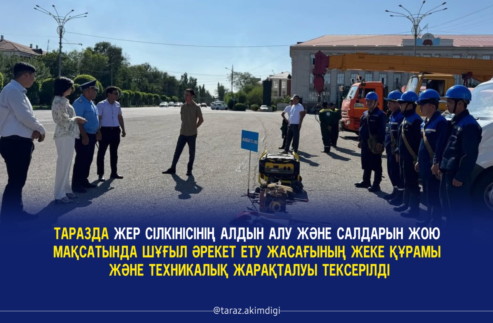 Бүгін Тараз қаласы әкімінің орынбасары Гүлдана Жауынбекова және Тараз қаласы төтенше жағдайлар басқармасының бастығы Ербол Амиров жер сілкінісінің алдын алу және салдарын жою мақсатында шұғыл әрекет ету жасағының жеке құрамын және техникалық жарақталуын тексерді.