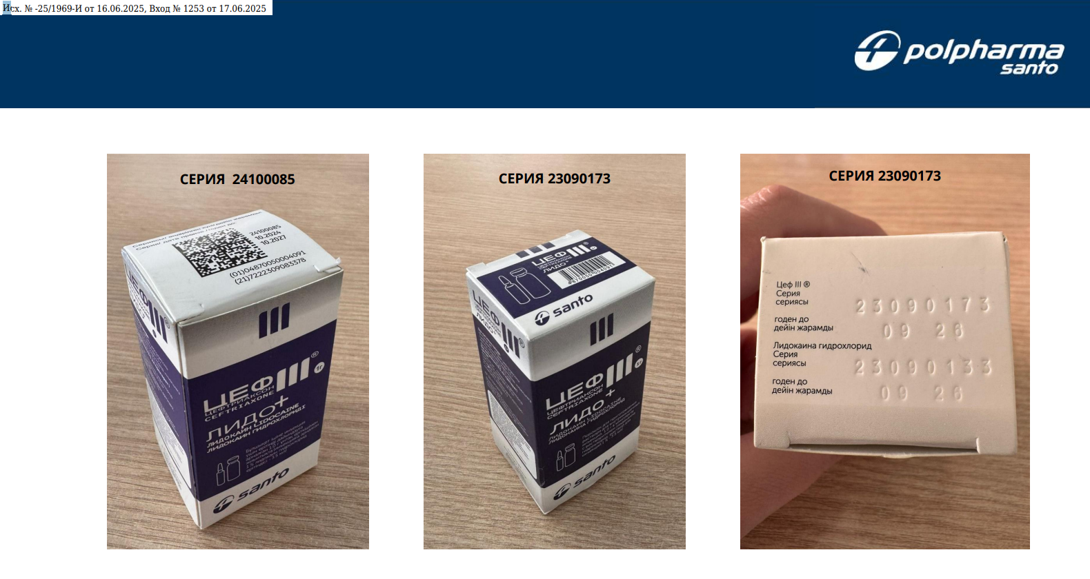 Қазақстан Республикасының Денсаулық сақтау министрлігі Медициналық және фармацевтикалық бақылау комитетінің Жамбыл облысы бойынша департаменті Қазақстан Республикасының Денсаулық сақтау министрлігінің медициналық және фармацевтикалық бақылау комитетінің 2025 жылдың 16 маусымдағы №-25/1969-И шығыс хатының негізінде, «Химфарм» АҚ-тың ақпаратына сәйкес Қазақстан Республикасының аумағында «Цеф III» + «Лидокаин» ұнтақ 1 гр. 1 шт.», сериялары № SEUE, жарамдылық мерзімі – 03.2026 және № SEUM, жарамдылық мерзімі – 03.2026, дәрілік заттың сериялары (партиялары) жалған деген күдікпен қаралатынын хабарлайды.
