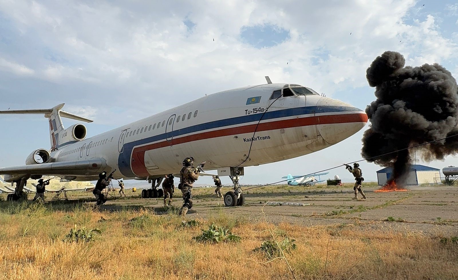Құқық қорғау және арнайы органдардың террористік сипаттағы қатерлерге ден қоюға дайындығын арттыру мақсатында Тараз қаласының «Әулие-Ата» халықаралық әуежайының аумағында кепілге алынғандарды босату бойынша терроризмге қарсы ауқымды оқу-жаттығулар өткізілді.