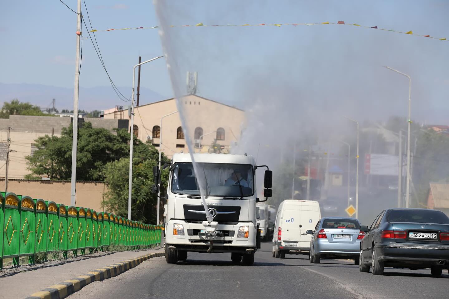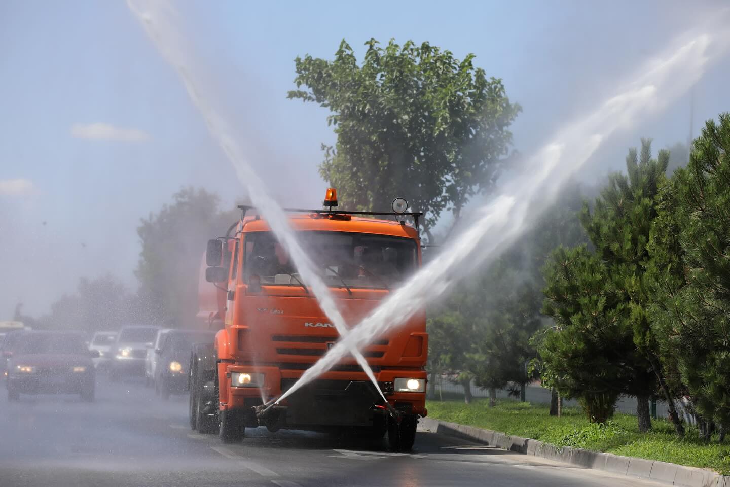 Суару жұмыстары арнайы техника мен бүріккіш құрылғылардың көмегімен күн сайын таңертең және кешкі уақытта жүйелі түрде атқарылуда.