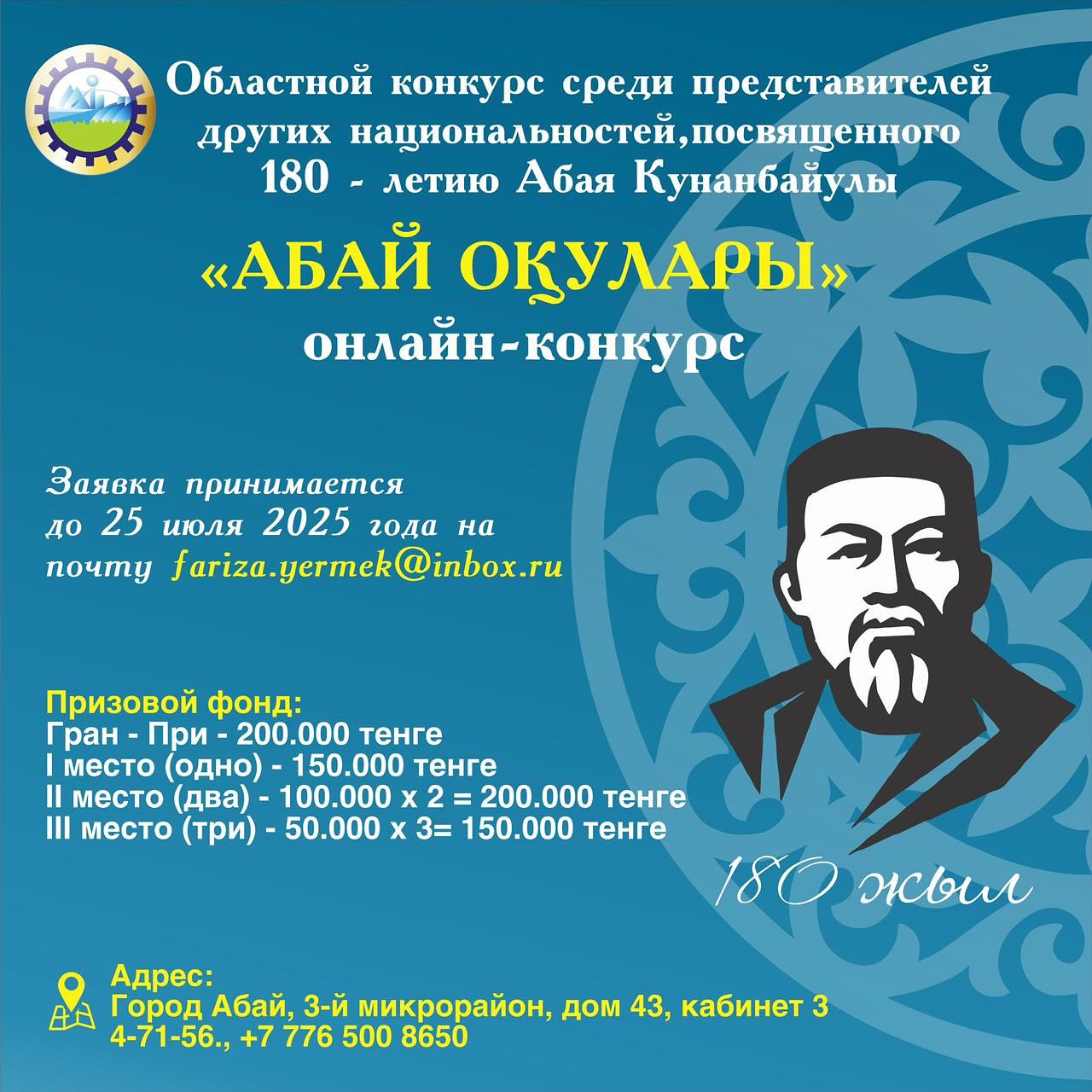 Абай Құнанбайұлының 180 жылдығына орай Абай ауданының мәдениет және тілдерді дамыту бөлімі облыстық деңгейде өзге ұлт өкілдері арасында онлайн форматта “Абай оқулары” байқауын ұйымдастыруда. Байқауға 14-29 жас аралығындағы үміткерлер қатыса алады. Шілденің 25-не дейін өтінім мен бейнероликтер fariza.yermek@inbox.ru электрондық поштасына қабылданады. Жүлдегерлерді марапаттау рәсімі 10 тамыз күні Абай қаласында өтеді.