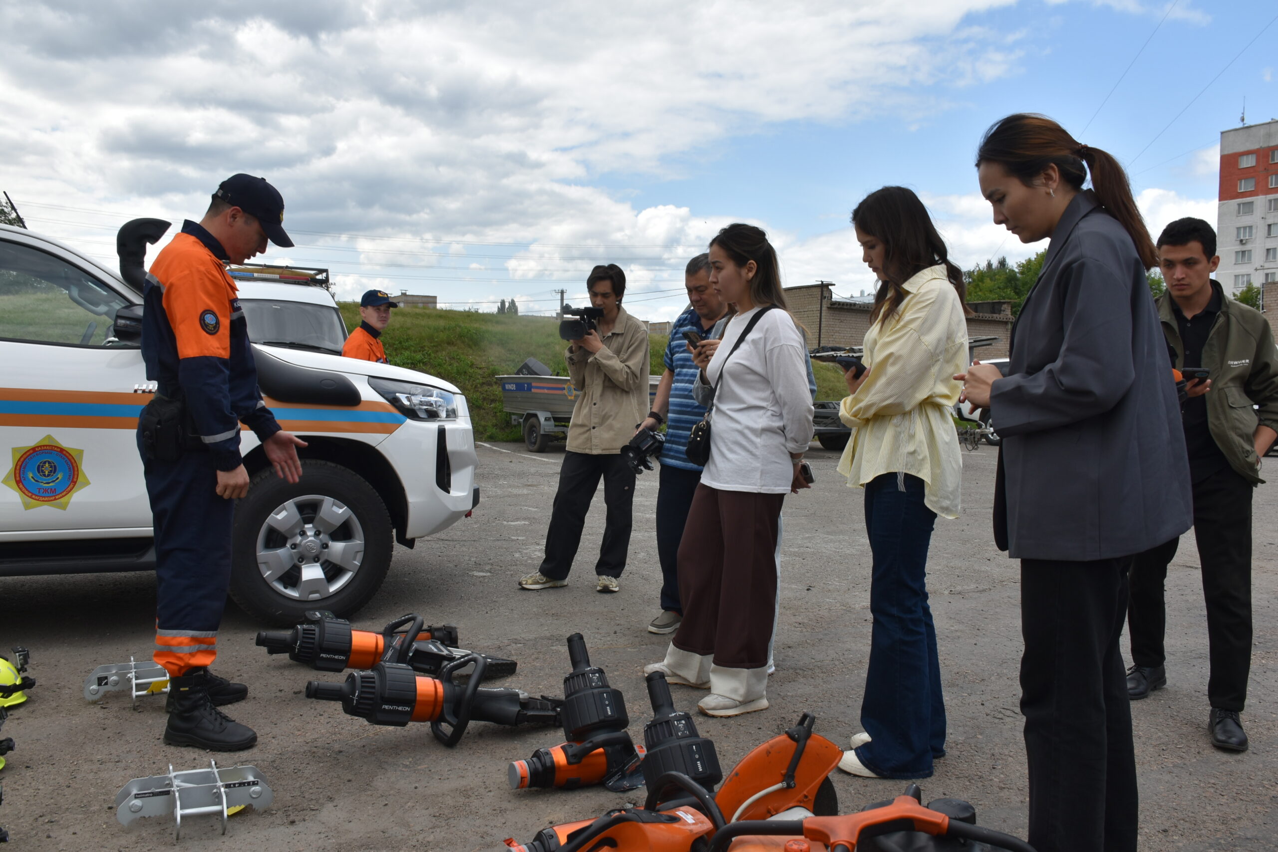 Қонақтар өңірдегі ең көне бөлімдердің бірінің күнделікті қызметімен, өрт сөндірушілер мен құтқарушылардың еңбек жағдайымен танысты. Оларға бөлім аумағында заманауи автокөліктер, құрал-жабдықтар мен арнайы киімдер көрсетілді. Журналистер өртті сөндіру, төтенше жағдайларды жою, апаттық-құтқару және іздестіру жұмыстарын жүргізу бойынша мазалаған сұрақтарына жан-жақты жауап алды.