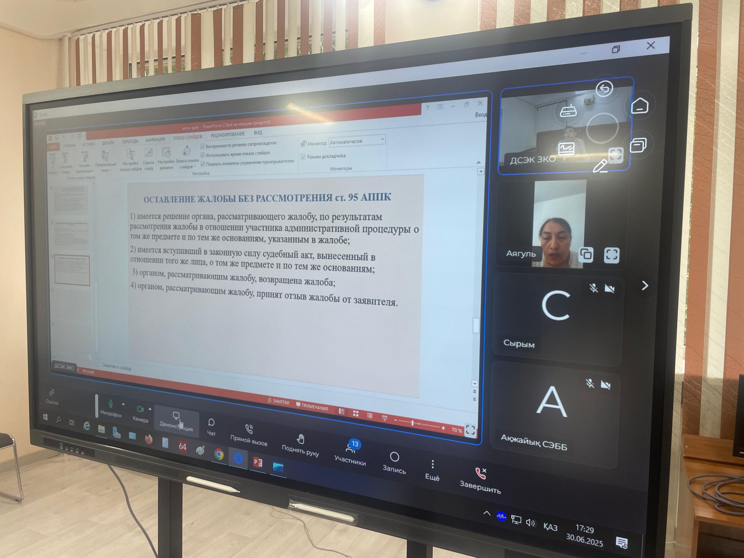 2025 жылдың 30 маусымында Құқықтық қамтамасыз ету бөлімінің басшысы А.С.Баймуханбетова “QOSYL” платформасы арқылы аудандық басқармалар мамандарына Әкімшілік рәсімдік-процесстік кодексінің нормаларын түсіндіру бойынша семинар өткізді.
