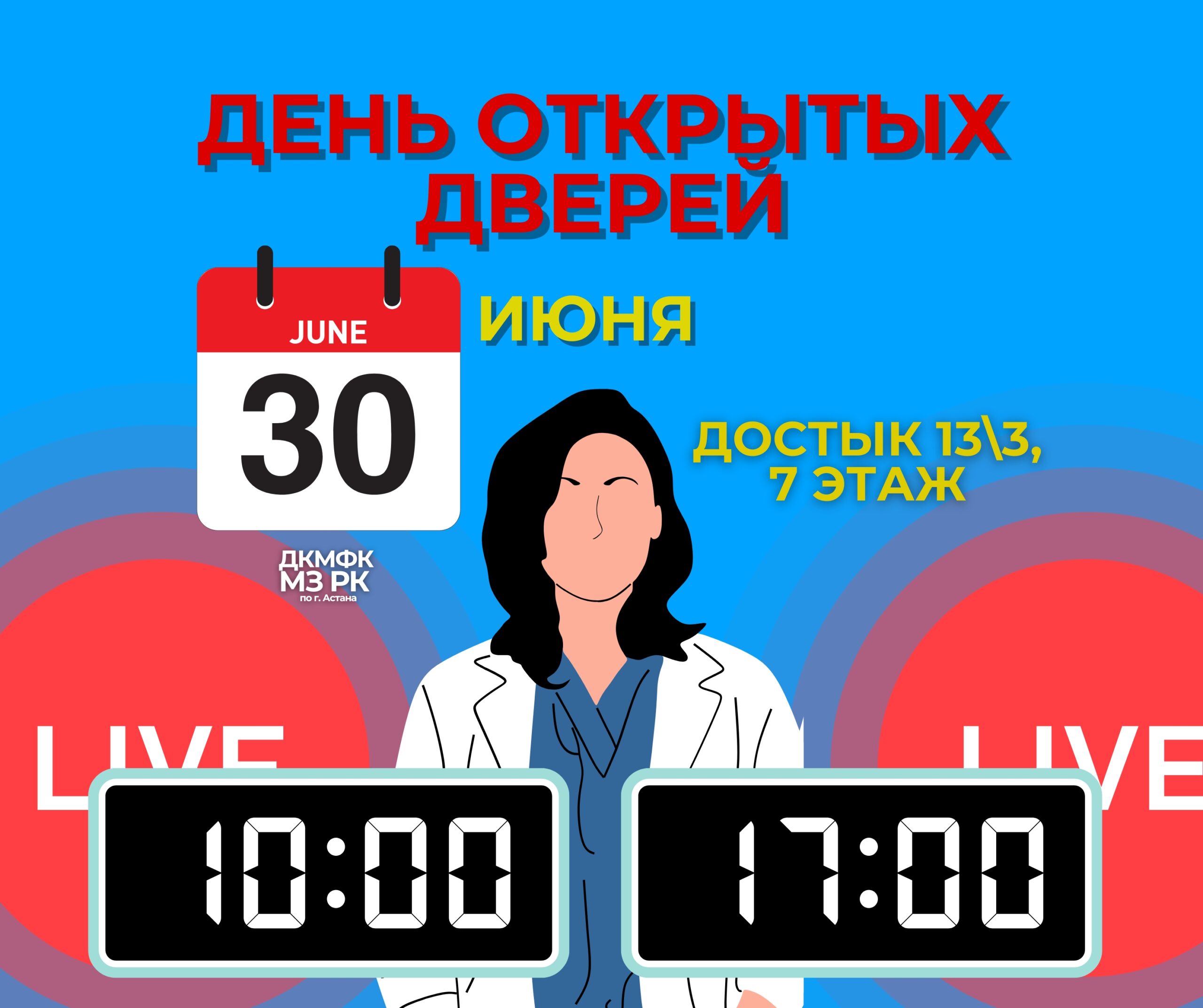 Қазақстан Республикасы Денсаулық сақтау министрлігі Медициналық және фармацевтикалық бақылау комитетінің Астана қаласы бойынша департаменті сізді 2025 жылғы 30 маусымда өтетін «Ашық есік күніне» шақырады, уақыты сағат 10.00-ден 17.00-ге дейін (түскі үзіліс сағат 13.00 ден 14.30-ға дейін ).