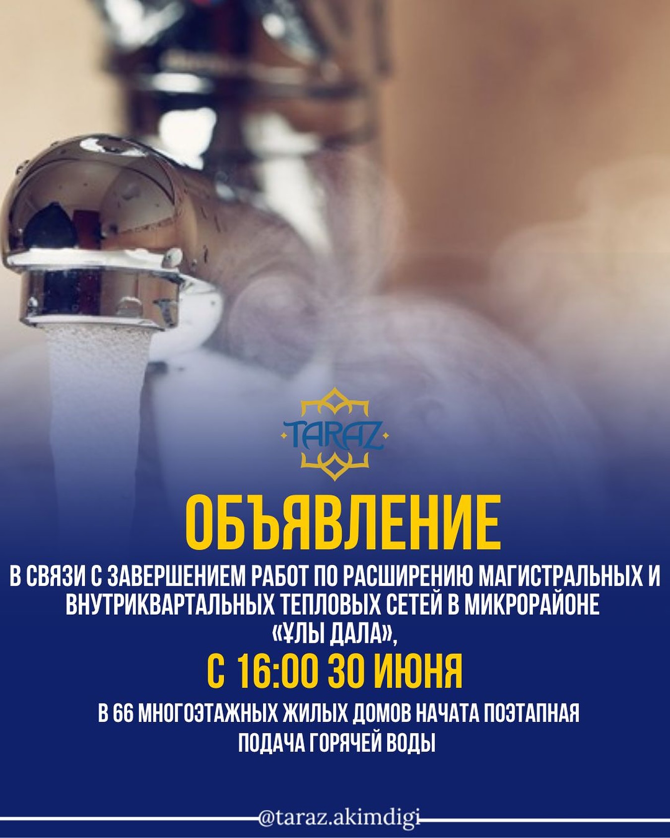 Құрметті 15 шағын ауданының тұрғындары! Магистралдық және ішкі кварталдық жылу желілерін кеңейту жұмыстарының аяқталуына байланысты 2025 жылдың 30 маусым сағат 16:00-ден бастап кезең-кезеңмен 66 көпқабатты тұрғын үйге яғни, төменде көрсетілген мекенжайлар бойынша ыстық су беріледі.