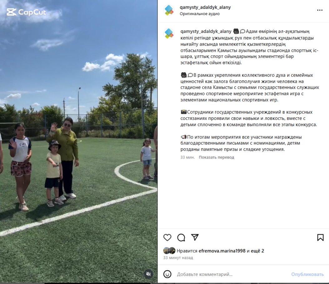 Ұжымдық рух пен отбасылық құндылықтарды адам өмірінің саламаттылығының кепілі ретінде нығайту шеңберінде Қамысты ауылының стадионында мемлекеттік қызметшілердің отбасыларымен ұлттық спорт ойындарының элементтері бар эстафеталық ойын спорттық іс-шарасы өткізілді. 📸Мемлекеттік мекемелердің қызметкерлері конкурстық жарыстарда өздерінің дағдылары мен ептіліктерін көрсетті, балалармен бірге командада конкурстың барлық кезеңдерін ұйымшылдықпен орындады.