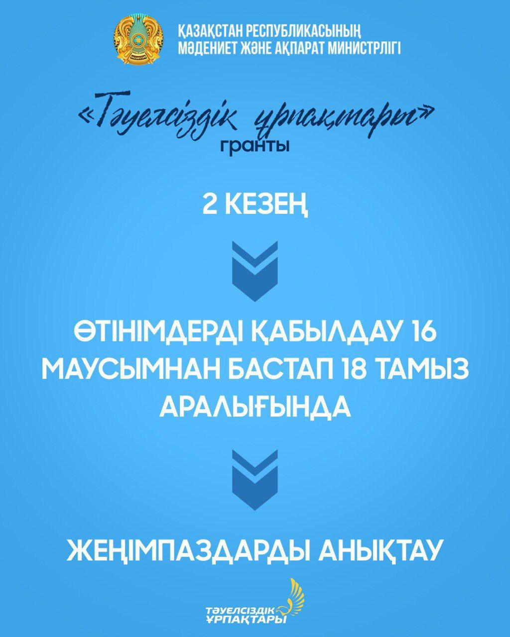 Қазақстан Республикасының Мәдениет және ақпарат министрлігі Мемлекет басшысы тағайындаған «Тәуелсіздік ұрпақтары» грантын беру бойынша конкурстың басталғанын жариялайды.