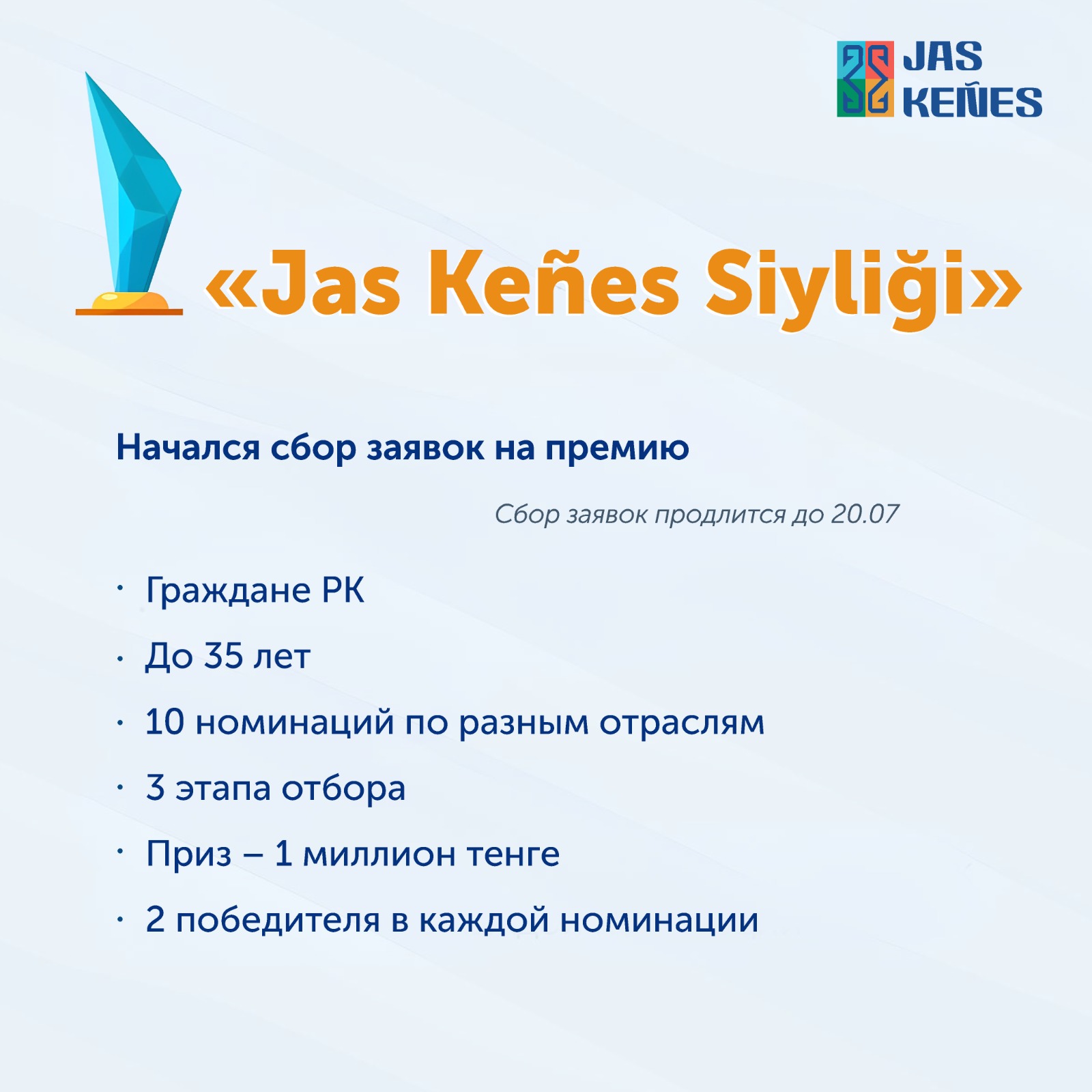 Сыйлыққа үміткер болу үшін Қазақстан Республикасының 35 жасқа толмаған азаматтары қатыса алады. Конкурсқа қатысуға өтінімді 2025 жылғы 20 маусым мен 20 шілде аралығында https://jas-kenes.kz/application сайтында беруге болады.