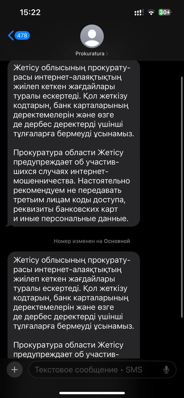 «Tele ұялы байланыс операторымен жасалған меморандум аясында облыс прокуратурасы абоненттерге интернет-алаяқтық жағдайлары туралы ескертумен профилактикалық SMS-тарату жүргізді.