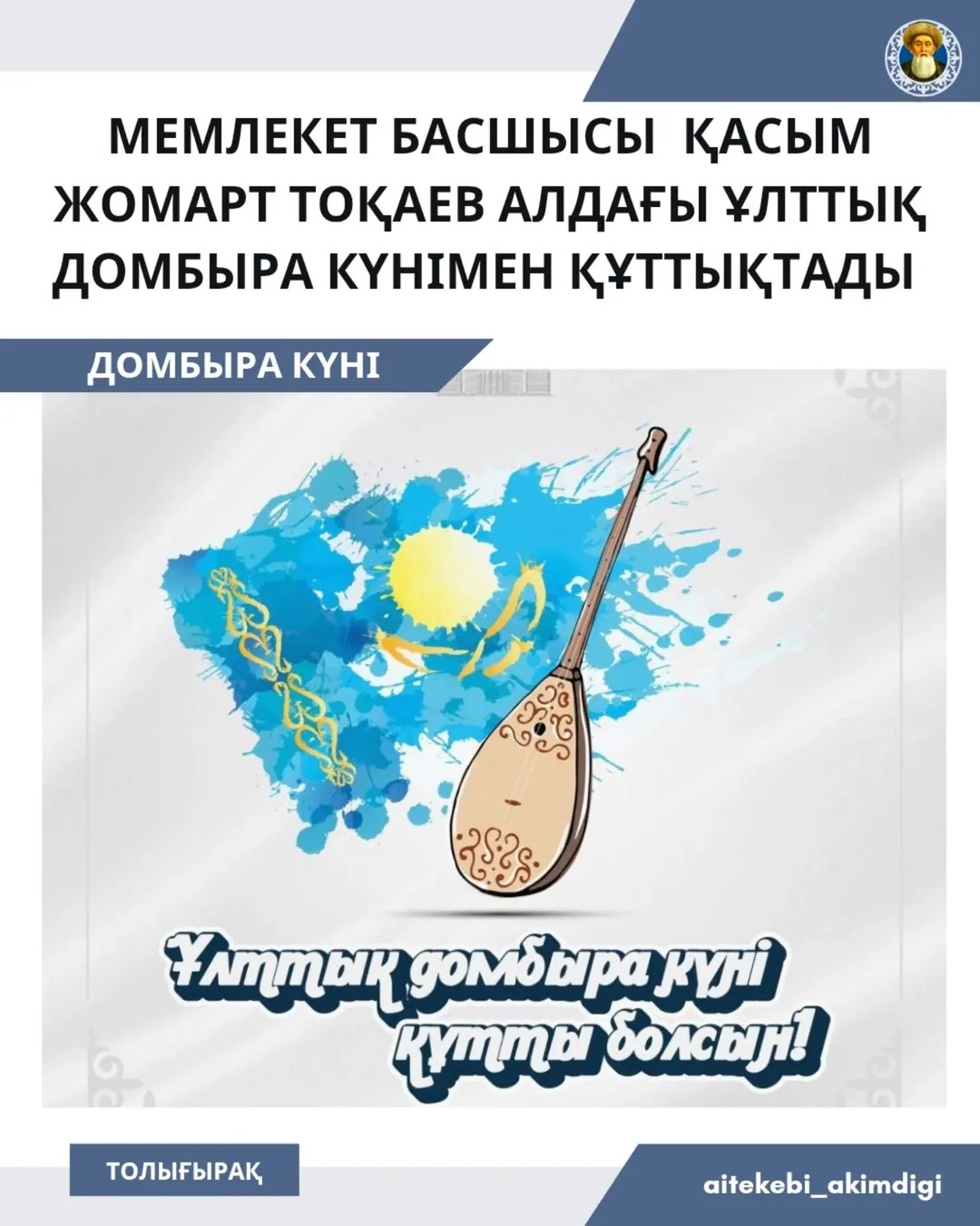 Домбыра – ұлт болмысы, халық қазынасы. «Қазақ – нағыз қазақ емес, нағыз қазақ – домбыра». Әсіресе, өскелең ұрпақтың домбыраға деген ықыласы ерекше. Жастар төл мәдениетімізді терең түсініп, салт-дәстүрімізге құрметпен қарайды. Бұл – өте жақсы үрдіс. Өйткені ата-бабаларымыздың мәдени мұрасын көздің қарашығындай сақтау – нағыз отаншылдықтың көрінісі. Отанға сүйіспеншілік – мемлекеттілігіміздің темірқазығы. Қазақстан жастарының мұны жақсы түсініп, қолдайтынына ризамын. Мемлекет руханият саласын барынша дамыта береді. Дәстүрлі өнердің дүлдүлдері Қайрат Байбосынов «Қазақстанның Еңбек Ері», Айгүл Үлкенбаева, Айгүл Қосанова «Қазақстанның халық әртісі» атағына ие болды. Қасиетті қара домбыраның күмбірін бүкіл әлемге паш етіп жүрген азаматтарға алғыс айтамын, – деп жазды Қасым-Жомарт Тоқаев өзінің X парақшасында.