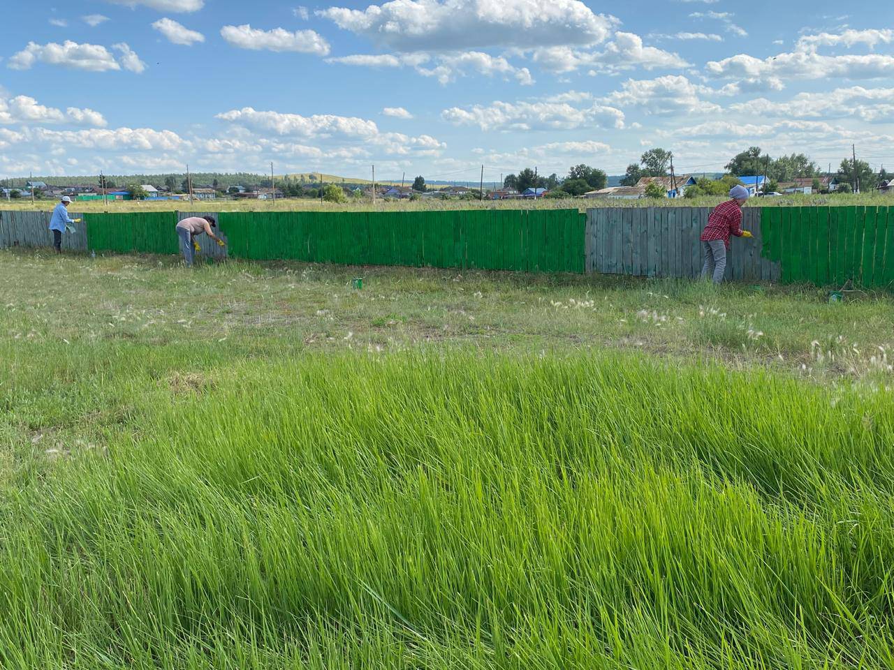 Әкім аппаратының қызметкерлері сенбілік өткізді. Спорт корты боялған, ескерткіштің жанында және Стелланың артында арамшөптерден гүлзарлар.