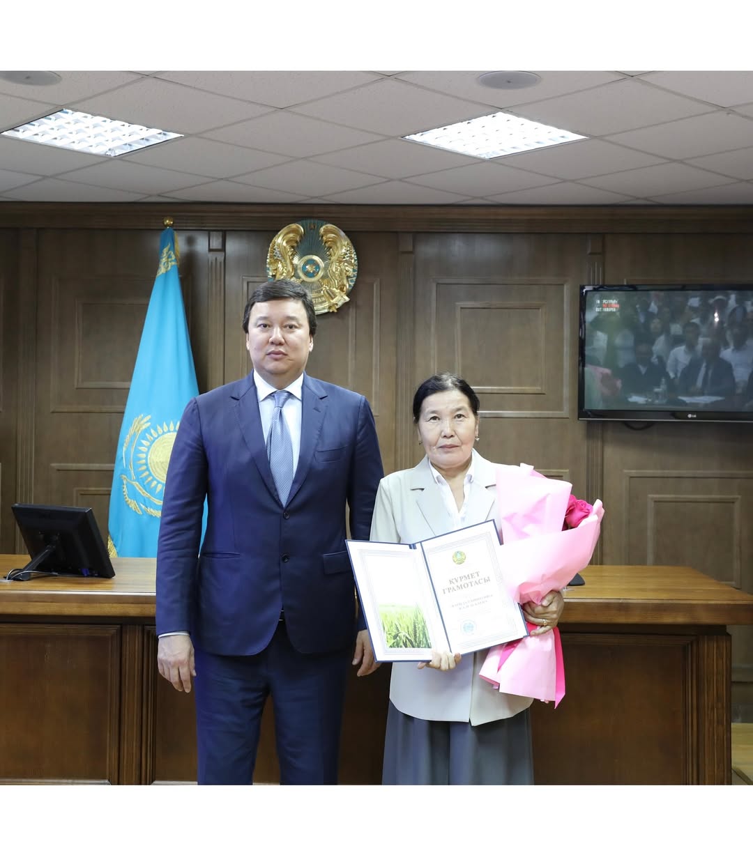 🗝️Көлік кілттерін табыстағанға дейін облыс әкімдігінің мәжіліс залында мерекелік жиын өтті. Облыс әкімінің орынбасары Ғалымжан Елеуов шарада ветеринария саласының дамуына қосқан үлесі үшін бірқатар маманды марапаттады. Атап айтқанда, Дархан Тойлыбаев – «Еңбек ардагері» төсбелгісін, Иса Базаров – «Ауыл шаруашылығы саласының үздігі» төсбелгісін, ҚР Мақсот Өмірзақов пен Фарида Жалғасбаева – Ауыл шаруашылығы министрлігінің Құрмет грамотасын иеленді.