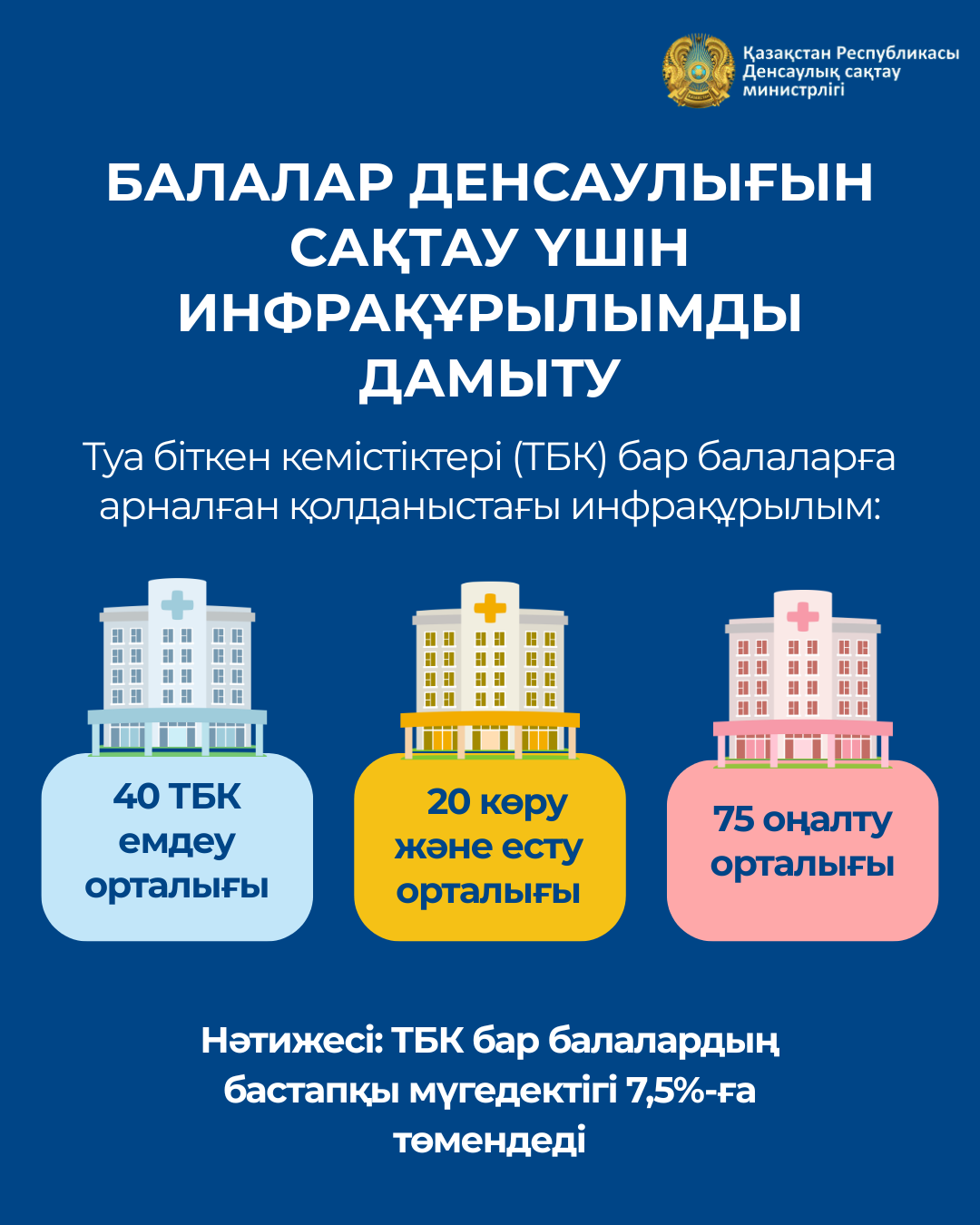 Қазіргі уақытта Қазақстанда 15 облыстық балалар ауруханасы жаңартылуда. Көпбейінді ауруханаларды жаңарту бойынша 18 өңірлік мастер-жоспар және облыстық перинаталдық орталықтарды жаңарту бойынша 17 мастер-жоспар бекітілді.