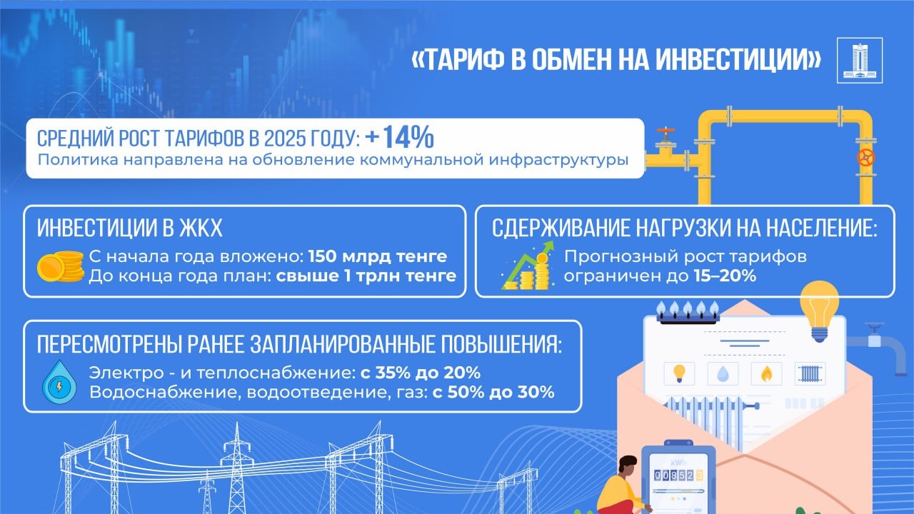 «Тарифті инвестицияға айырбастау» саясаты шеңберінде 2025 жылы реттелетін қызметтерге тарифтердің өсуі орта есеппен 14%-ды құрады. Бұл коммуналдық инфрақұрылымды жаңғырту үшін ресурс берді: жыл басынан бері ТКШ саласына 150 млрд теңгеден астам инвестиция бағытталды, ал жыл соңына дейін салымдар көлемі 1 трлн теңгеден асады.