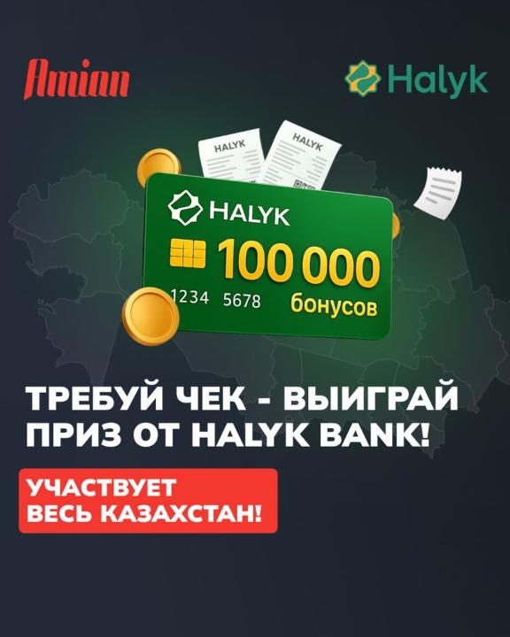 Қазақстан Республикасы Қаржы министрлігі Мемлекеттік кірістер комитеті Halyk Bank және Amian мобильді қосымшасымен бірлесіп, «Чекті талап ет – Halyk Bank-тен сыйлық ұтып ал!» атты республикалық акцияны іске қосады. Бұл бастама қолма-қол ақшасыз есеп айырысуды танымал етуге, фискалдық тәртіпті арттыруға және тұтынушылардың саналы мінез-құлқын қалыптастыруға бағытталған.
